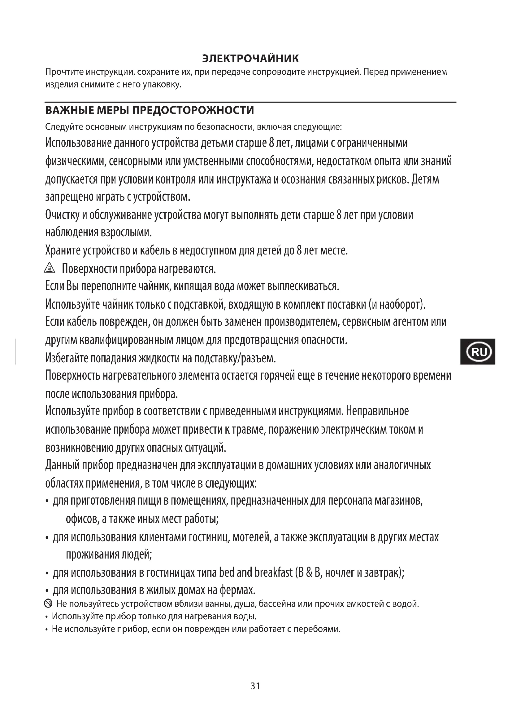 Jotta vältettäisiin vaarallisista aineista ympäristölle ja terveydelle koituvat haitat, näillä symboleilla varustettuja laitteita sekä ladattavia ja kertakäyttöisiä paristoja ei saa hävittää lajittelemattomana sekajätteenä. Hävitä sähkö- ja elektroniikkatuotteet sekä, mikäli sovellettavissa, ladattavat ja kertakäyttöiset paristot asianmukaiseen viralliseen kierrätys-/keräilypisteeseen.31 ЭЛЕКТРОЧАЙНИК Прочтите инструкции, сохраните их, при передаче сопроводите инструкцией. Перед применением изделия снимите с него упаковку. ВАЖНЫЕ МЕРЫ ПРЕДОСТОРОЖНОСТИ Следуйте основным инструкциям по безопасности, включая следующие: Использование данного устройства детьми старше 8 лет, лицами с ограниченными физическими, сенсорными или умственными способностями, недостатком опыта или знаний допускается при условии контроля или инструктажа и осознания связанных рисков. Детям запрещено играть с устройством. Очистку и обслуживание устройства могут выполнять дети старше 8 лет при условии наблюдения взрослыми. Храните устройство и кабель в недоступном для детей до 8 лет месте. h Поверхности прибора нагреваются. Если Вы переполните чайник, кипящая вода может выплескиваться. Используйте чайник только с подставкой, входящую в комплект поставки (и наоборот). Если кабель поврежден, он должен быть заменен производителем, сервисным агентом или другим квалифицированным лицом для предотвращения опасности. Избегайте попадания жидкости на подставку/разъем. Поверхность нагревательного элемента остается горячей еще в течение некоторого времени после использования прибора. Используйте прибор в соответствии с приведенными инструкциями. Неправильное использование прибора может привести к травме, поражению электрическим током и возникновению других опасных ситуаций. Данный прибор предназначен для эксплуатации в домашних условиях или аналогичных областях применения, в том числе в следующих: