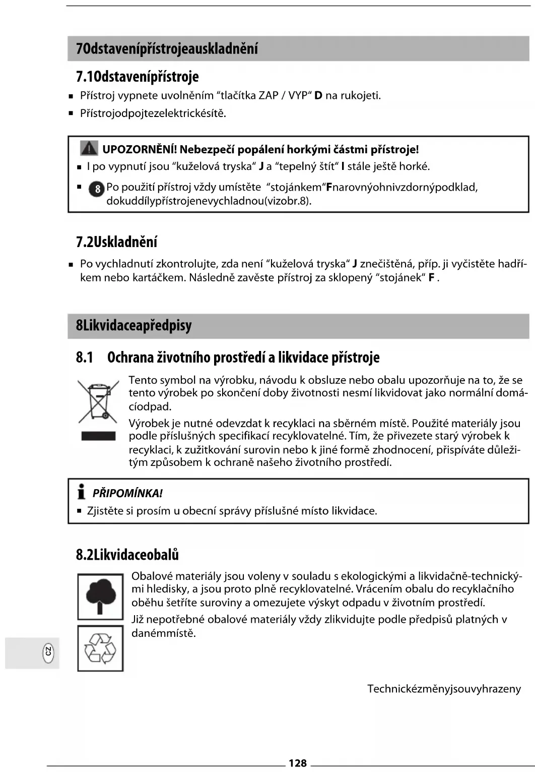После охлаждения проверить, не загрязнено ли „коническое сопло“J, при необходи- мости очистить салфеткой или щеткой. После этого подвесить аппарат за сложенную „опорную скобу“ F. 8 Утилизация и правовые вопросы