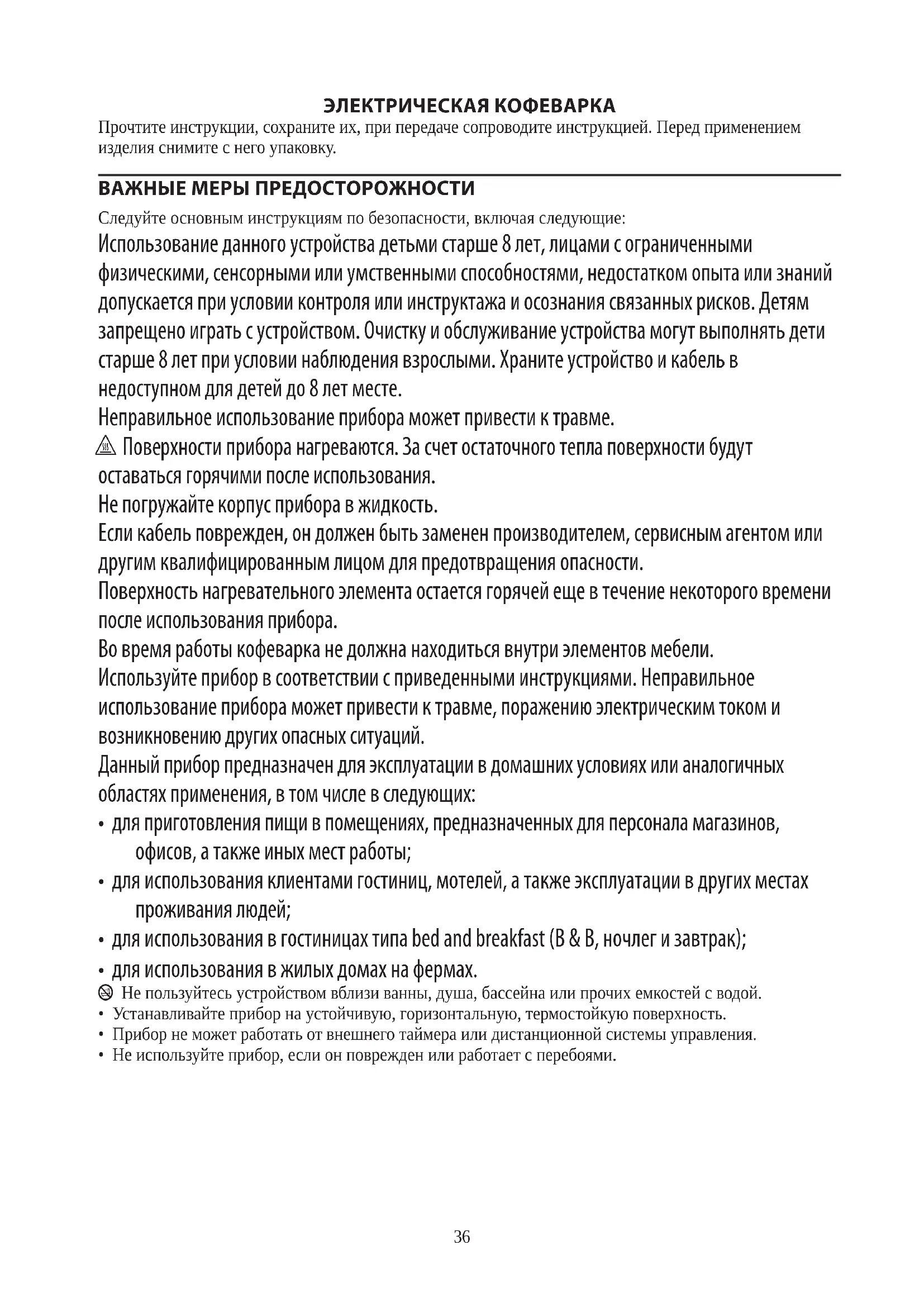 AE36 ЭЛЕКТРИЧЕСКАЯ КОФЕВАРКА Прочтите инструкции, сохраните их, при передаче сопроводите инструкцией. Перед применением изделия снимите с него упаковку. ВАЖНЫЕ МЕРЫ ПРЕДОСТОРОЖНОСТИ Следуйте основным инструкциям по безопасности, включая следующие: Использование данного устройства детьми старше 8 лет, лицами с ограниченными физическими, сенсорными или умственными способностями, недостатком опыта или знаний допускается при условии контроля или инструктажа и осознания связанных рисков. Детям запрещено играть с устройством. Очистку и обслуживание устройства могут выполнять дети старше 8 лет при условии наблюдения взрослыми. Храните устройство и кабель в недоступном для детей до 8 лет месте. Неправильное использование прибора может привести к травме. h Поверхности прибора нагреваются. За счет остаточного тепла поверхности будут оставаться горячими после использования. Не погружайте корпус прибора в жидкость. Если кабель поврежден, он должен быть заменен производителем, сервисным агентом или другим квалифицированным лицом для предотвращения опасности. Поверхность нагревательного элемента остается горячей еще в течение некоторого времени после использования прибора. Во время работы кофеварка не должна находиться внутри элементов мебели. Используйте прибор в соответствии с приведенными инструкциями. Неправильное использование прибора может привести к травме, поражению электрическим током и возникновению других опасных ситуаций. Данный прибор предназначен для эксплуатации в домашних условиях или аналогичных областях применения, в том числе в следующих: