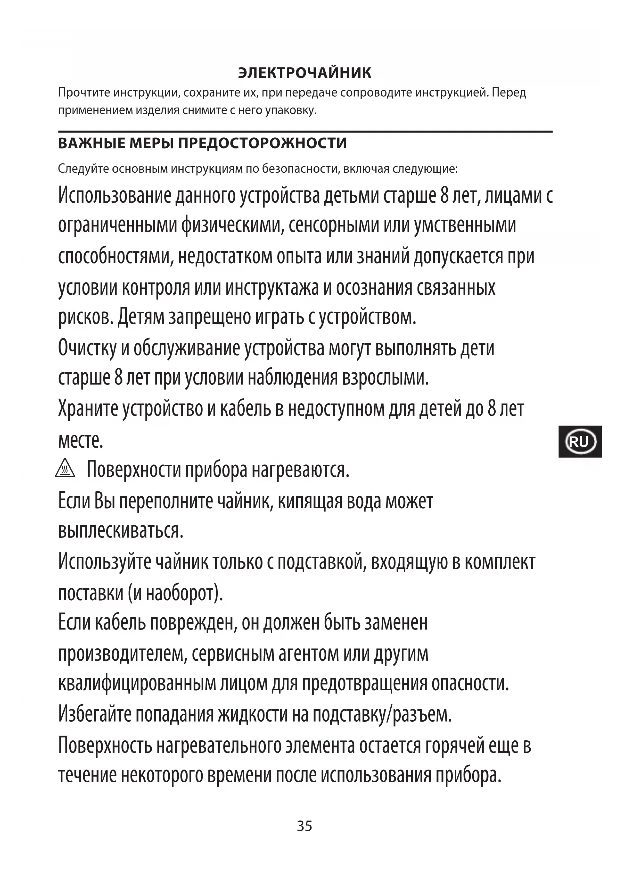 Jotta vältettäisiin vaarallisista aineista ympäristölle ja terveydelle koituvat haitat, näillä symboleilla varustettuja laitteita sekä ladattavia ja kertakäyttöisiä paristoja ei saa hävittää lajittelemattomana sekajätteenä. Hävitä sähkö- ja elektroniikkatuotteet sekä, mikäli sovellettavissa, ladattavat ja kertakäyttöiset paristot asianmukaiseen viralliseen kierrätys-/ keräilypisteeseen.35 ЭЛЕКТРОЧАЙНИК Прочтите инструкции, сохраните их, при передаче сопроводите инструкцией. Перед применением изделия снимите с него упаковку. ВАЖНЫЕ МЕРЫ ПРЕДОСТОРОЖНОСТИ Следуйте основным инструкциям по безопасности, включая следующие: Использование данного устройства детьми старше 8 лет, лицами с ограниченными физическими, сенсорными или умственными способностями, недостатком опыта или знаний допускается при условии контроля или инструктажа и осознания связанных рисков. Детям запрещено играть с устройством. Очистку и обслуживание устройства могут выполнять дети старше 8 лет при условии наблюдения взрослыми. Храните устройство и кабель в недоступном для детей до 8 лет