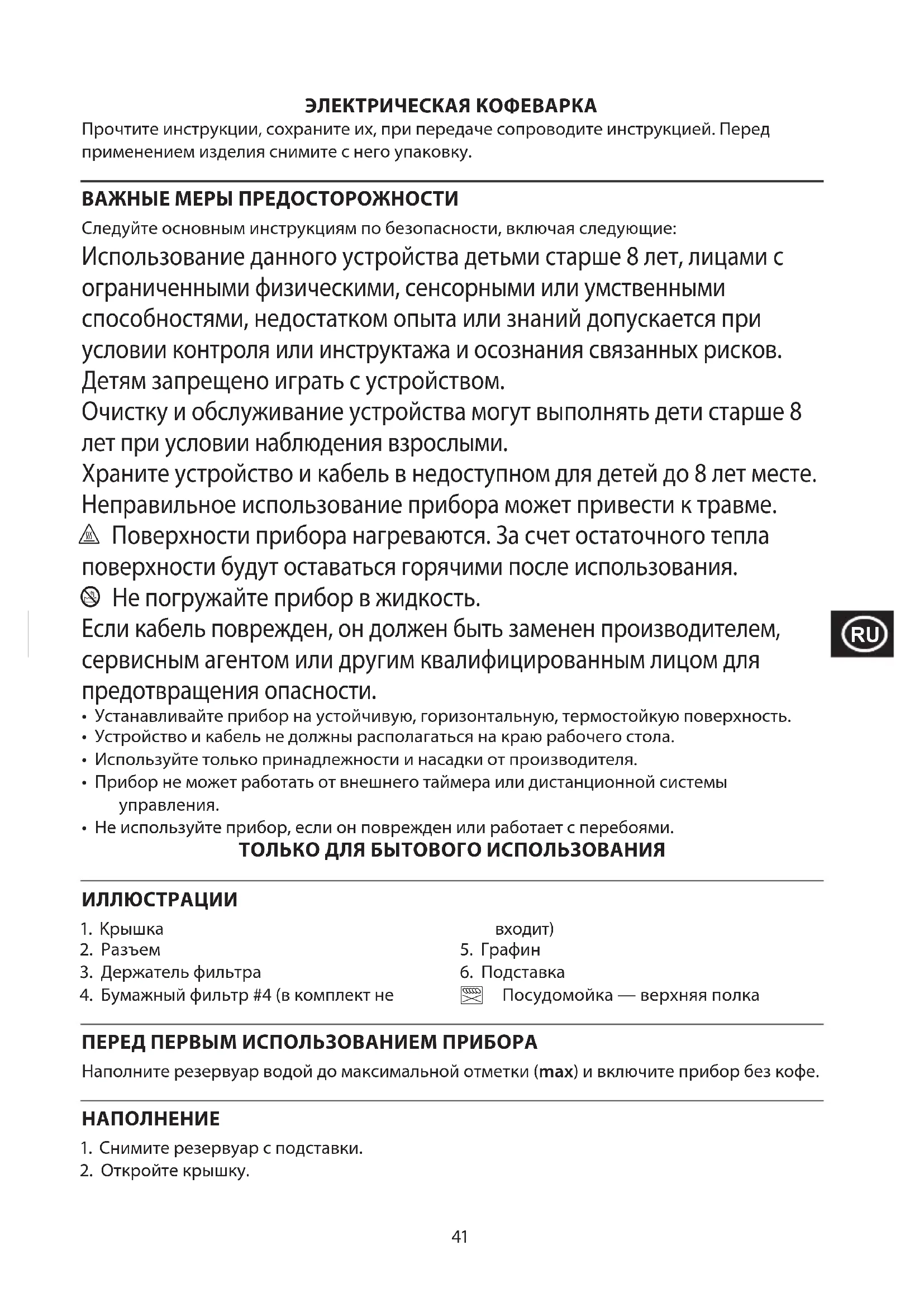 Jotta vältettäisiin vaarallisista aineista ympäristölle ja terveydelle koituvat haitat, näillä symboleilla varustettuja laitteita sekä ladattavia ja kertakäyttöisiä paristoja ei saa hävittää lajittelemattomana sekajätteenä. Hävitä sähkö- ja elektroniikkatuotteet sekä, mikäli sovellettavissa, ladattavat ja kertakäyttöiset paristot asianmukaiseen viralliseen kierrätys-/ keräilypisteeseen.41 ЭЛЕКТРИЧЕСКАЯ КОФЕВАРКА Прочтите инструкции, сохраните их, при передаче сопроводите инструкцией. Перед применением изделия снимите с него упаковку. ВАЖНЫЕ МЕРЫ ПРЕДОСТОРОЖНОСТИ Следуйте основным инструкциям по безопасности, включая следующие: Использование данного устройства детьми старше 8 лет, лицами с ограниченными физическими, сенсорными или умственными способностями, недостатком опыта или знаний допускается при условии контроля или инструктажа и осознания связанных рисков. Детям запрещено играть с устройством. Очистку и обслуживание устройства могут выполнять дети старше 8 лет при условии наблюдения взрослыми. Храните устройство и кабель в недоступном для детей до 8 лет месте. Неправильное использование прибора может привести к травме. h Поверхности прибора нагреваются. За счет остаточного тепла поверхности будут оставаться горячими после использования. l Не погружайте прибор в жидкость. Если кабель поврежден, он должен быть заменен производителем, сервисным агентом или другим квалифицированным лицом для предотвращения опасности.
