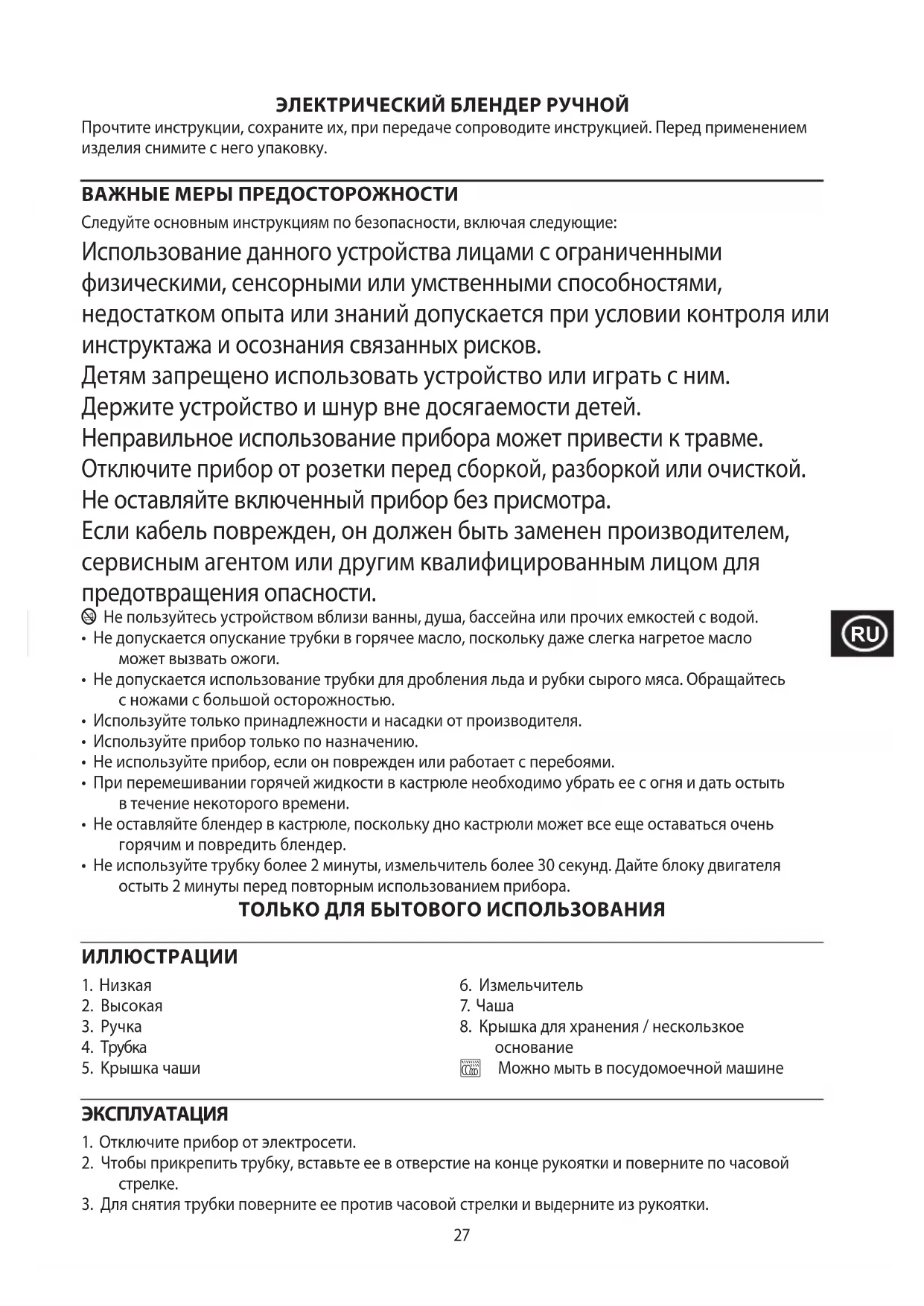 Jotta vältettäisiin vaarallisista aineista ympäristölle ja terveydelle koituvat haitat, näillä symboleilla varustettuja laitteita sekä ladattavia ja kertakäyttöisiä paristoja ei saa hävittää lajittelemattomana sekajätteenä. Hävitä sähkö- ja elektroniikkatuotteet sekä, mikäli sovellettavissa, ladattavat ja kertakäyttöiset paristot asianmukaiseen viralliseen kierrätys-/keräilypisteeseen.27 ЭЛЕКТРИЧЕСКИЙ БЛЕНДЕР РУЧНОЙ Прочтите инструкции, сохраните их, при передаче сопроводите инструкцией. Перед применением изделия снимите с него упаковку. ВАЖНЫЕ МЕРЫ ПРЕДОСТОРОЖНОСТИ Следуйте основным инструкциям по безопасности, включая следующие: Использование данного устройства лицами с ограниченными физическими, сенсорными или умственными способностями, недостатком опыта или знаний допускается при условии контроля или инструктажа и осознания связанных рисков. Детям запрещено использовать устройство или играть с ним. Держите устройство и шнур вне досягаемости детей. Неправильное использование прибора может привести к травме. Отключите прибор от розетки перед сборкой, разборкой или очисткой. Не оставляйте включенный прибор без присмотра. Если кабель поврежден, он должен быть заменен производителем, сервисным агентом или другим квалифицированным лицом для предотвращения опасности. b Не пользуйтесь устройством вблизи ванны, душа, бассейна или прочих емкостей с водой.