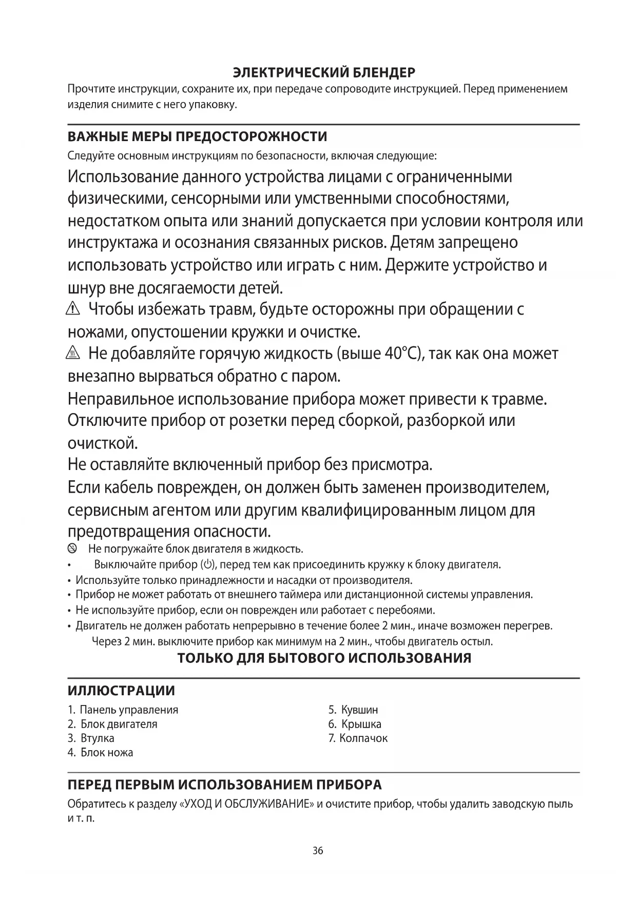 AE36 ЭЛЕКТРИЧЕСКИЙ БЛЕНДЕР Прочтите инструкции, сохраните их, при передаче сопроводите инструкцией. Перед применением изделия снимите с него упаковку. ВАЖНЫЕ МЕРЫ ПРЕДОСТОРОЖНОСТИ Следуйте основным инструкциям по безопасности, включая следующие: Использование данного устройства лицами с ограниченными физическими, сенсорными или умственными способностями, недостатком опыта или знаний допускается при условии контроля или инструктажа и осознания связанных рисков. Детям запрещено использовать устройство или играть с ним. Держите устройство и шнур вне досягаемости детей. c Чтобы избежать травм, будьте осторожны при обращении с ножами, опустошении кружки и очистке. h Не добавляйте горячую жидкость (выше 40°C), так как она может внезапно вырваться обратно с паром. Неправильное использование прибора может привести к травме. Отключите прибор от розетки перед сборкой, разборкой или
