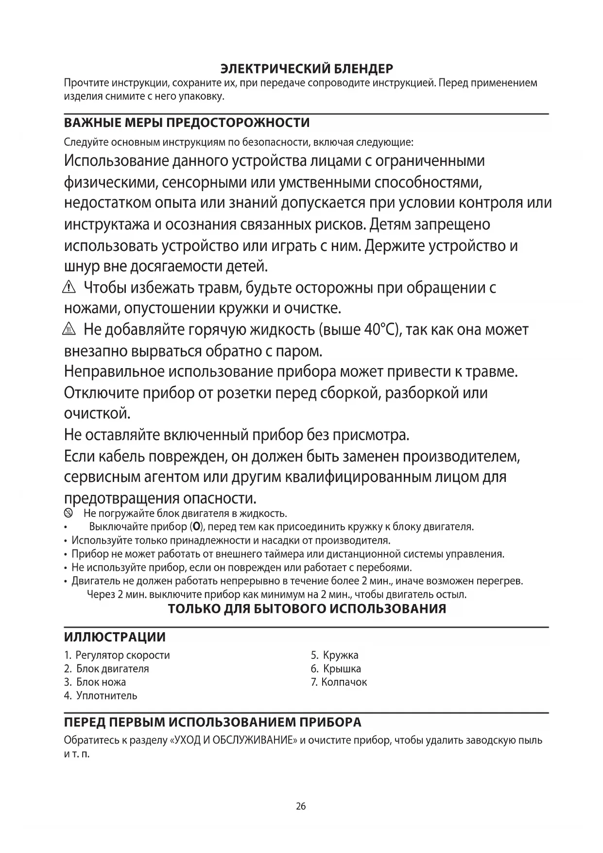 Не оставляйте включенный прибор без присмотра. Если кабель поврежден, он должен быть заменен производителем, сервисным агентом или другим квалифицированным лицом для предотвращения опасности. l Не погружайте блок двигателя в жидкость.