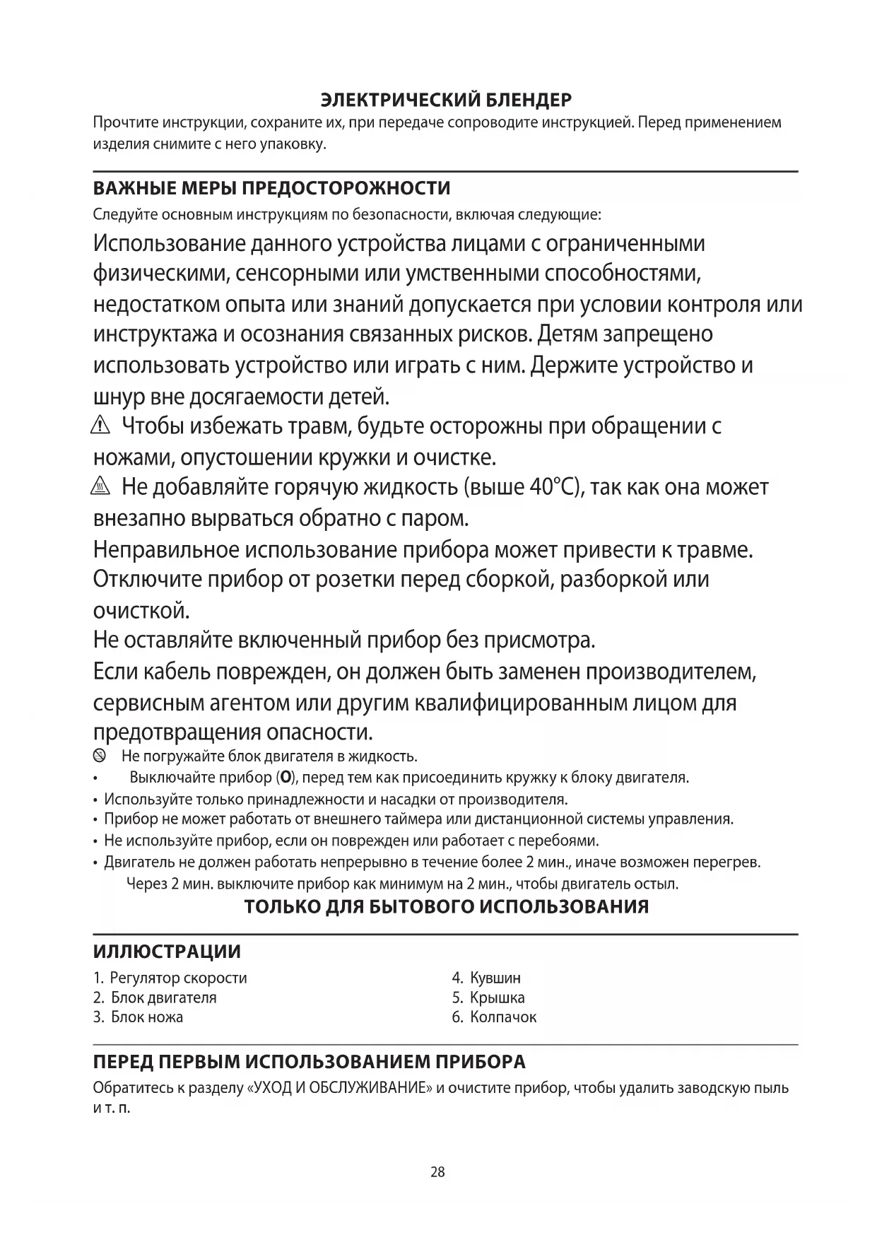 AE28 ЭЛЕКТРИЧЕСКИЙ БЛЕНДЕР Прочтите инструкции, сохраните их, при передаче сопроводите инструкцией. Перед применением изделия снимите с него упаковку. ВАЖНЫЕ МЕРЫ ПРЕДОСТОРОЖНОСТИ Следуйте основным инструкциям по безопасности, включая следующие: Использование данного устройства лицами с ограниченными физическими, сенсорными или умственными способностями, недостатком опыта или знаний допускается при условии контроля или инструктажа и осознания связанных рисков. Детям запрещено использовать устройство или играть с ним. Держите устройство и шнур вне досягаемости детей. c Чтобы избежать травм, будьте осторожны при обращении с ножами, опустошении кружки и очистке. h Не добавляйте горячую жидкость (выше 40°C), так как она может внезапно вырваться обратно с паром. Неправильное использование прибора может привести к травме. Отключите прибор от розетки перед сборкой, разборкой или