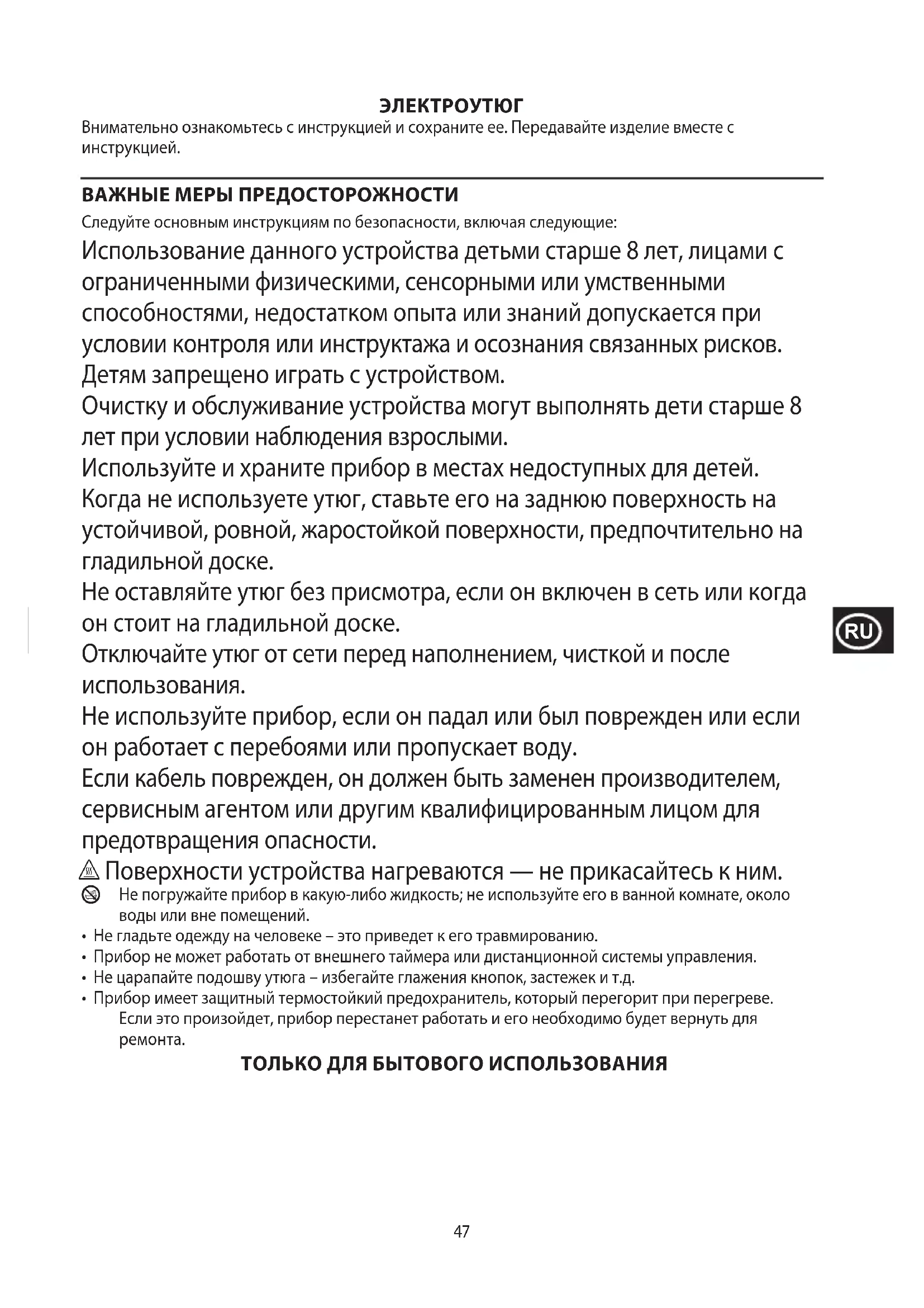 ЭЛЕКТРОУТЮГ Внимательно ознакомьтесь с инструкцией и сохраните ее. Передавайте изделие вместе с инструкцией. ВАЖНЫЕ МЕРЫ ПРЕДОСТОРОЖНОСТИ Следуйте основным инструкциям по безопасности, включая следующие: Использование данного устройства детьми старше 8 лет, лицами с ограниченными физическими, сенсорными или умственными способностями, недостатком опыта или знаний допускается при условии контроля или инструктажа и осознания связанных рисков. Детям запрещено играть с устройством. Очистку и обслуживание устройства могут выполнять дети старше 8 лет при условии наблюдения взрослыми. Используйте и храните прибор в местах недоступных для детей. Когда не используете утюг, ставьте его на заднюю поверхность на устойчивой, ровной, жаростойкой поверхности, предпочтительно на гладильной доске. Не оставляйте утюг без присмотра, если он включен в сеть или когда он стоит на гладильной доске. Отключайте утюг от сети перед наполнением, чисткой и после использования. Не используйте прибор, если он падал или был поврежден или если он работает с перебоями или пропускает воду. Если кабель поврежден, он должен быть заменен производителем, сервисным агентом или другим квалифицированным лицом для предотвращения опасности. h Поверхности устройства нагреваются — не прикасайтесь к ним.