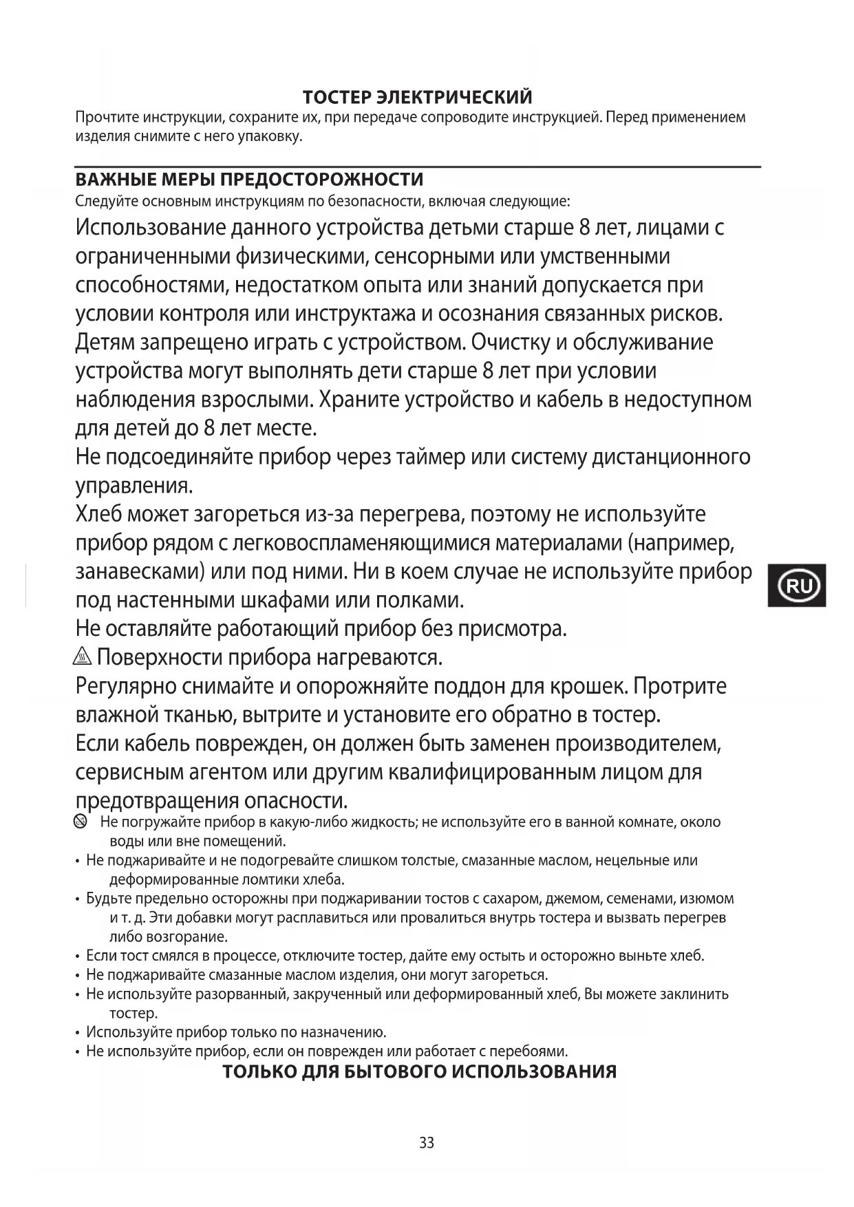 Jotta vältettäisiin vaarallisista aineista ympäristölle ja terveydelle koituvat haitat, näillä symboleilla varustettuja laitteita sekä ladattavia ja kertakäyttöisiä paristoja ei saa hävittää lajittelemattomana sekajätteenä. Hävitä sähkö- ja elektroniikkatuotteet sekä, mikäli sovellettavissa, ladattavat ja kertakäyttöiset paristot asianmukaiseen viralliseen kierrätys-/keräilypisteeseen.33 ТОСТЕР ЭЛЕКТРИЧЕСКИЙ Прочтите инструкции, сохраните их, при передаче сопроводите инструкцией. Перед применением изделия снимите с него упаковку. ВАЖНЫЕ МЕРЫ ПРЕДОСТОРОЖНОСТИ Следуйте основным инструкциям по безопасности, включая следующие: Использование данного устройства детьми старше 8 лет, лицами с ограниченными физическими, сенсорными или умственными способностями, недостатком опыта или знаний допускается при условии контроля или инструктажа и осознания связанных рисков. Детям запрещено играть с устройством. Очистку и обслуживание устройства могут выполнять дети старше 8 лет при условии наблюдения взрослыми. Храните устройство и кабель в недоступном для детей до 8 лет месте. Не подсоединяйте прибор через таймер или систему дистанционного управления. Хлеб может загореться из-за перегрева, поэтому не используйте прибор рядом с легковоспламеняющимися материалами (например, занавесками) или под ними. Ни в коем случае не используйте прибор под настенными шкафами или полками. Не оставляйте работающий прибор без присмотра. h Поверхности прибора нагреваются. Регулярно снимайте и опорожняйте поддон для крошек. Протрите влажной тканью, вытрите и установите его обратно в тостер. Если кабель поврежден, он должен быть заменен производителем, сервисным агентом или другим квалифицированным лицом для предотвращения опасности. b Не погружайте прибор в какую-либо жидкость; не используйте его в ванной комнате, около воды или вне помещений.