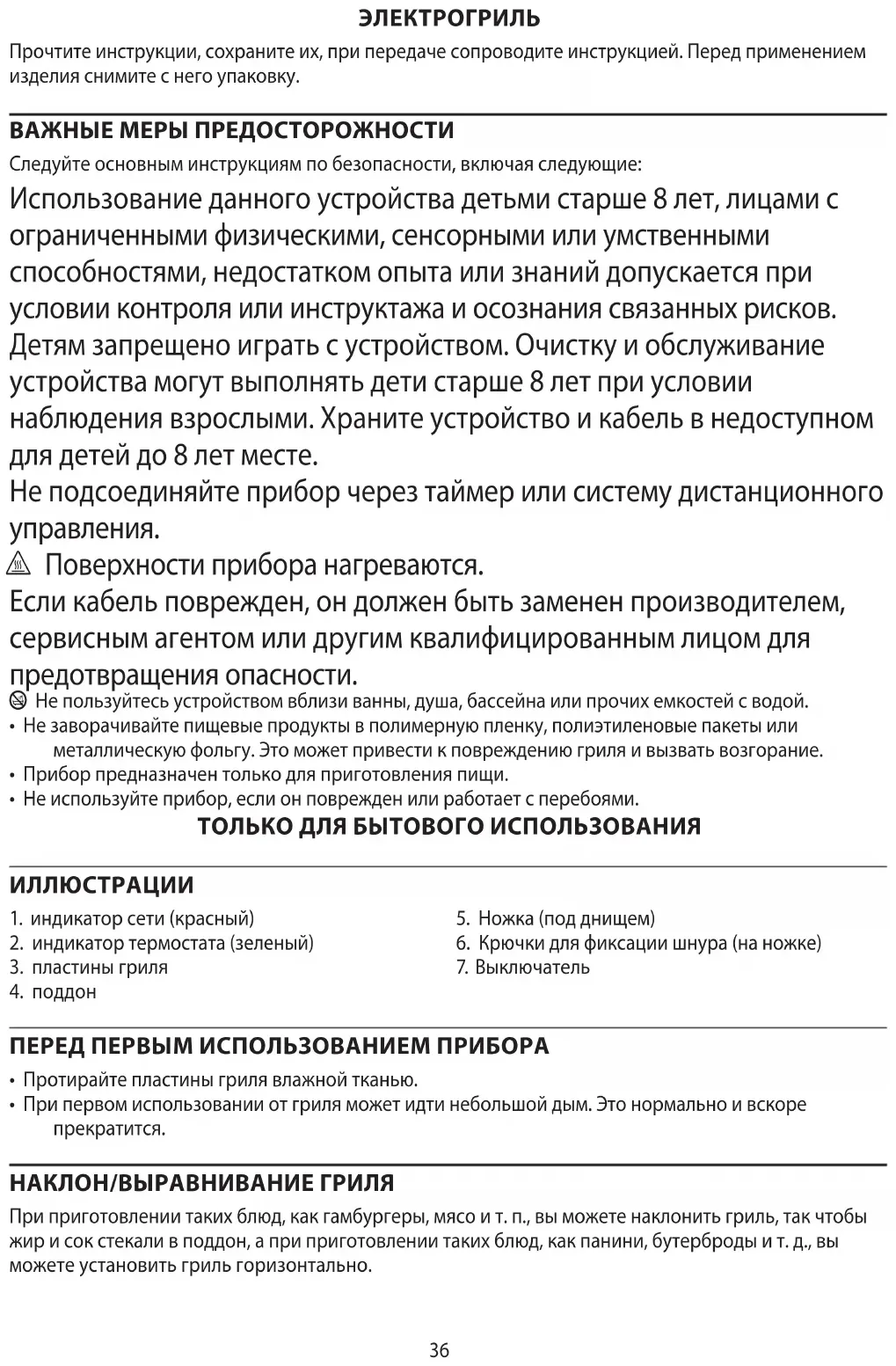 AE36 ЭЛЕКТРОГРИЛЬ Прочтите инструкции, сохраните их, при передаче сопроводите инструкцией. Перед применением изделия снимите с него упаковку. ВАЖНЫЕ МЕРЫ ПРЕДОСТОРОЖНОСТИ Следуйте основным инструкциям по безопасности, включая следующие: Использование данного устройства детьми старше 8 лет, лицами с ограниченными физическими, сенсорными или умственными способностями, недостатком опыта или знаний допускается при условии контроля или инструктажа и осознания связанных рисков. Детям запрещено играть с устройством. Очистку и обслуживание устройства могут выполнять дети старше 8 лет при условии наблюдения взрослыми. Храните устройство и кабель в недоступном для детей до 8 лет месте. Не подсоединяйте прибор через таймер или систему дистанционного управления. ¬ Поверхности прибора нагреваются. Если кабель поврежден, он должен быть заменен производителем, сервисным агентом или другим квалифицированным лицом для предотвращения опасности. b Не пользуйтесь устройством вблизи ванны, душа, бассейна или прочих емкостей с водой.