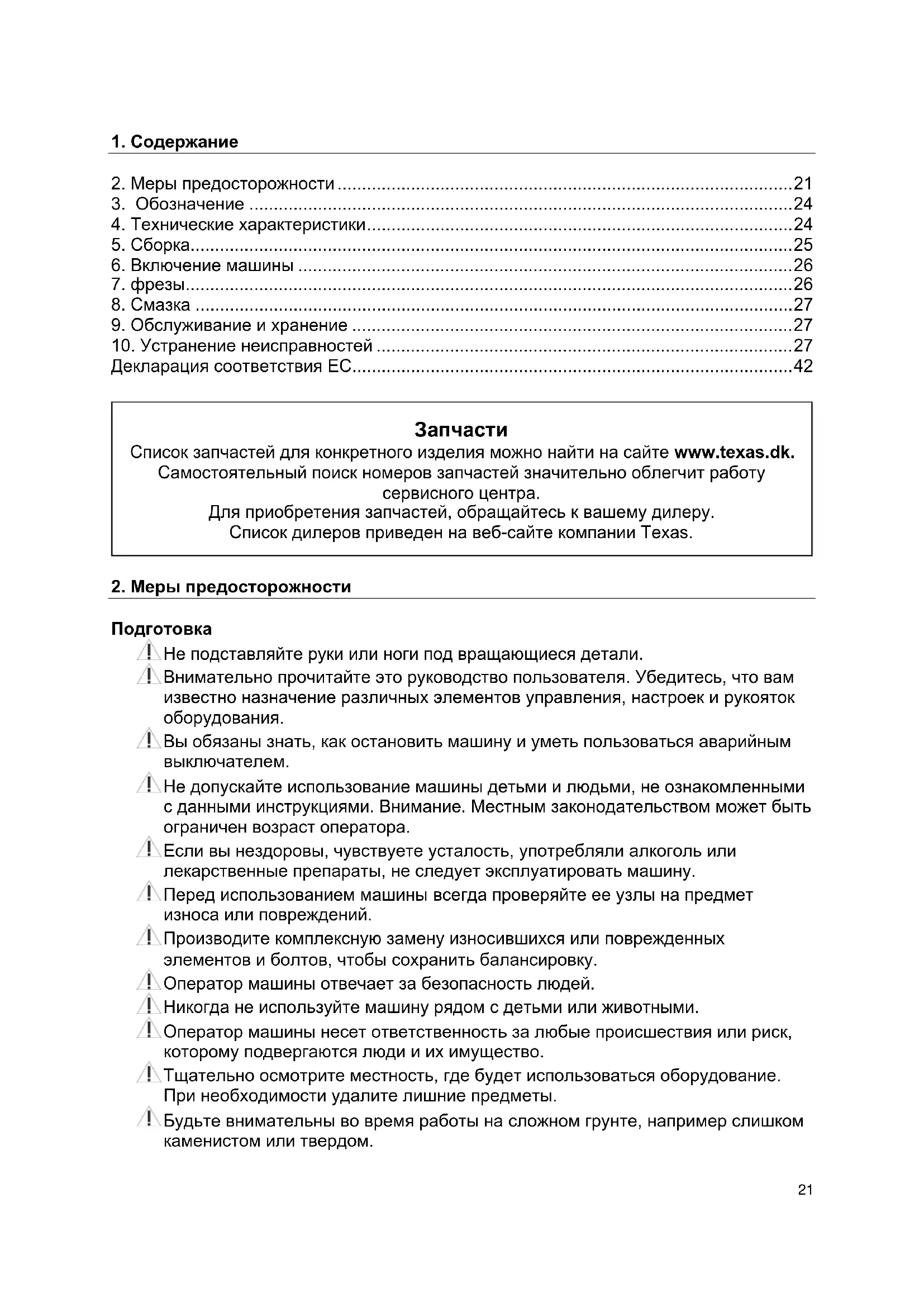 Список запчастей для конкретного изделия можно найти на сайте www.texas.dk. Самостоятельный поиск номеров запчастей значительно облегчит работу сервисного центра. Для приобретения запчастей, обращайтесь к вашему дилеру. Список дилеров приведен на веб-сайте компании Texas.22 Используйте ботинки со стальными носками и нескользящей подошвой. Не надевайте неплотно сидящую одежду. Использование Всегда запускайте двигатель, находясь в безопасной зоне. Не покидайте безопасную зону во время эксплуатации машины. Если необходимо выйти из безопасной зоны, заблаговременно выключите