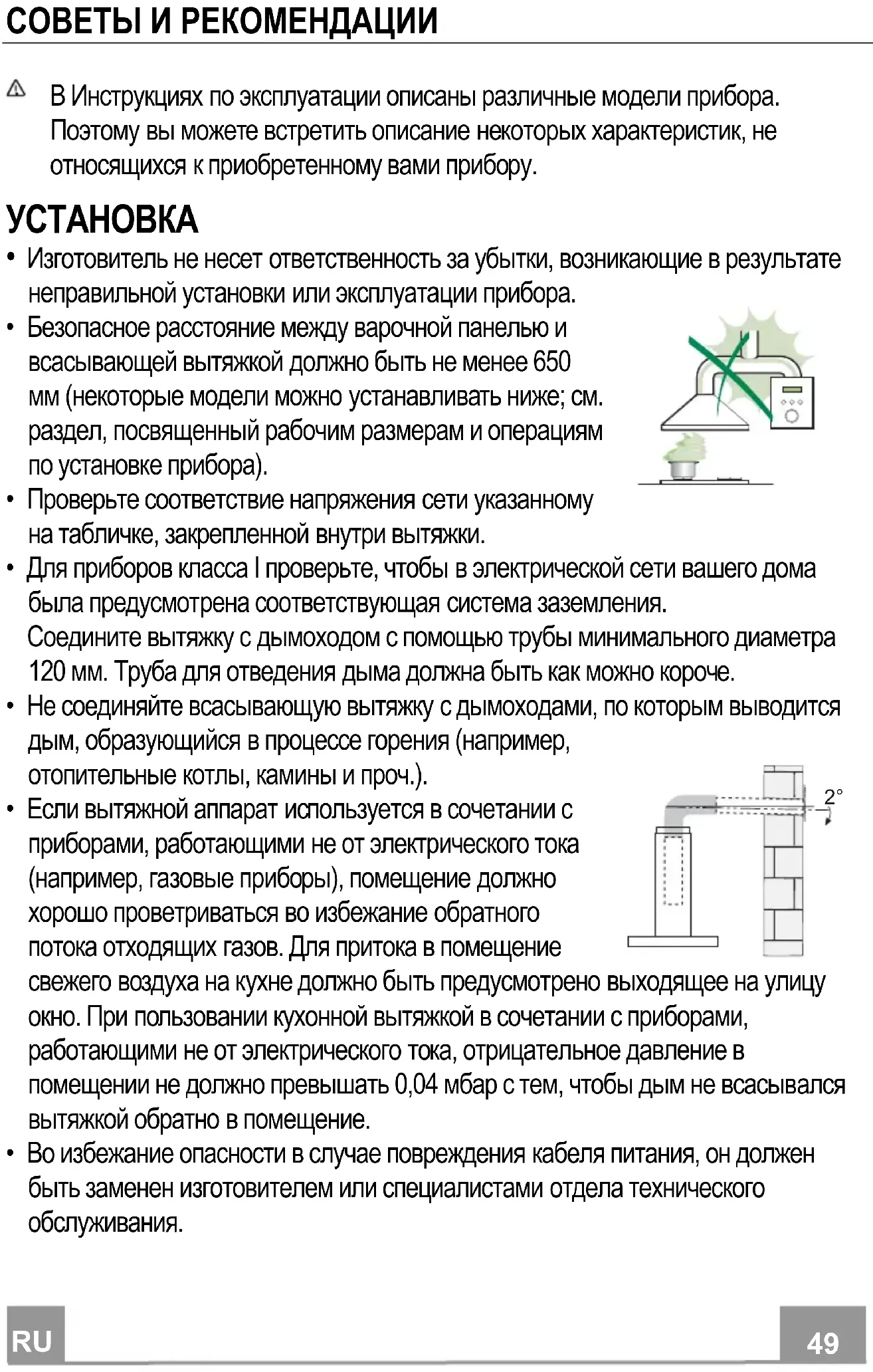 • Если вытяжной аппарат используется в сочетании с приборами, работающими не от электрического тока (например, газовые приборы), помещение должно хорошо проветриваться во избежание обратного потока отходящих газов. Для притока в помещение свежего воздуха на кухне должно быть предусмотрено выходящее на улицу окно. При пользовании кухонной вытяжкой в сочетании с приборами, работающими не от электрического тока, отрицательное давление в помещении не должно превышать 0,04 мбар с тем, чтобы дым не всасывался вытяжкой обратно в помещение.