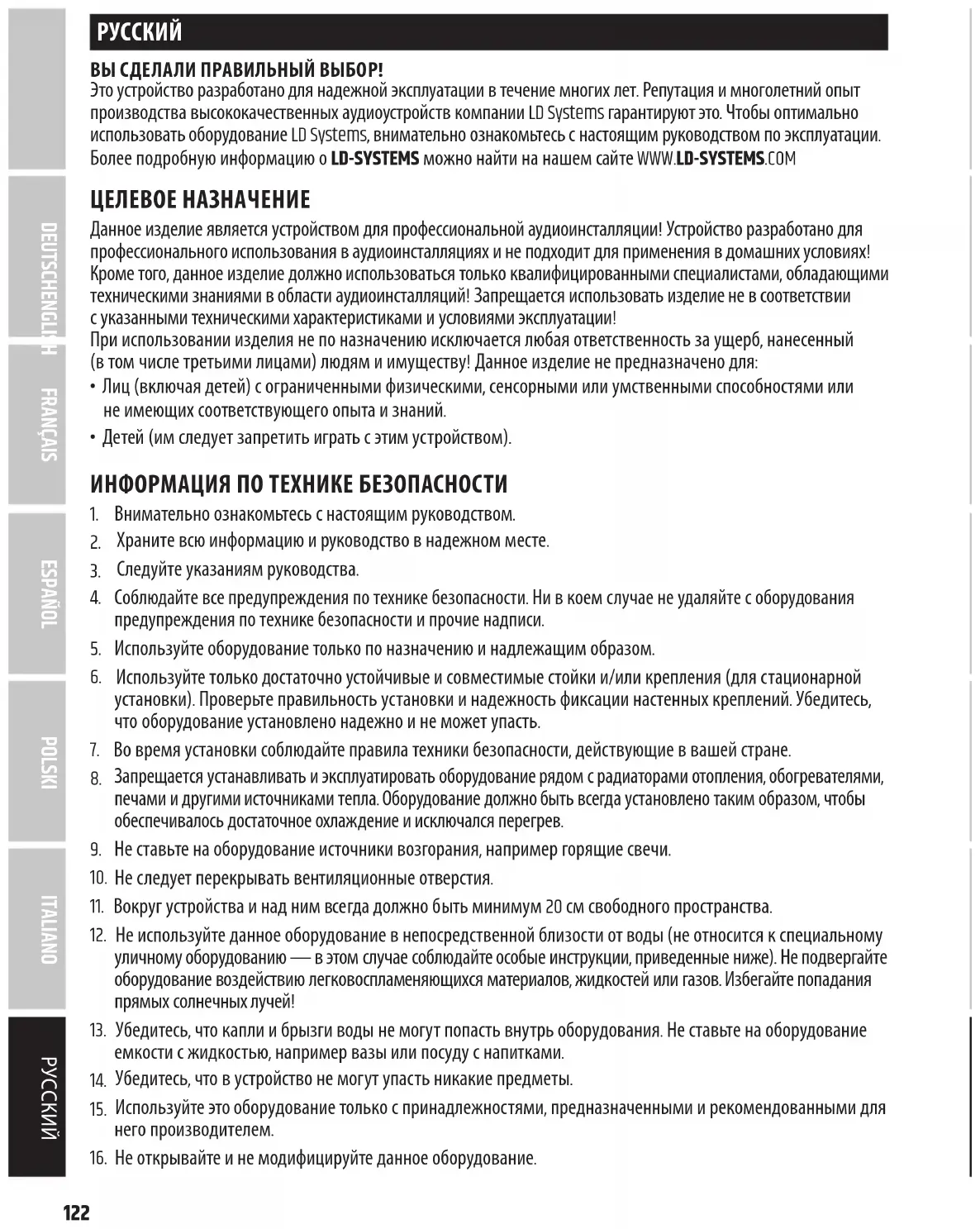 ВЫ СДЕЛАЛИ ПРАВИЛЬНЫЙ ВЫБОР! Это устройство разработано для надежной эксплуатации в течение многих лет. Репутация и многолетний опыт производства высококачественных аудиоустройств компании LD Systems гарантируют это. Чтобы оптимально использовать оборудование LD Systems, внимательно ознакомьтесь с настоящим руководством по эксплуатации. Более подробную информацию о LD-SYSTEMS можно найти на нашем сайте WWW.LD-SYSTEMS.COM ЦЕЛЕВОЕ НАЗНАЧЕНИЕ Данное изделие является устройством для профессиональной аудиоинсталляции! Устройство разработано для профессионального использования в аудиоинсталляциях и не подходит для применения в домашних условиях! Кроме того, данное изделие должно использоваться только квалифицированными специалистами, обладающими техническими знаниями в области аудиоинсталляций! Запрещается использовать изделие не в соответствии суказанными техническими характеристиками и условиями эксплуатации! При использовании изделия не по назначению исключается любая ответственность за ущерб, нанесенный (втом числе третьими лицами) людям и имуществу! Данное изделие не предназначено для: