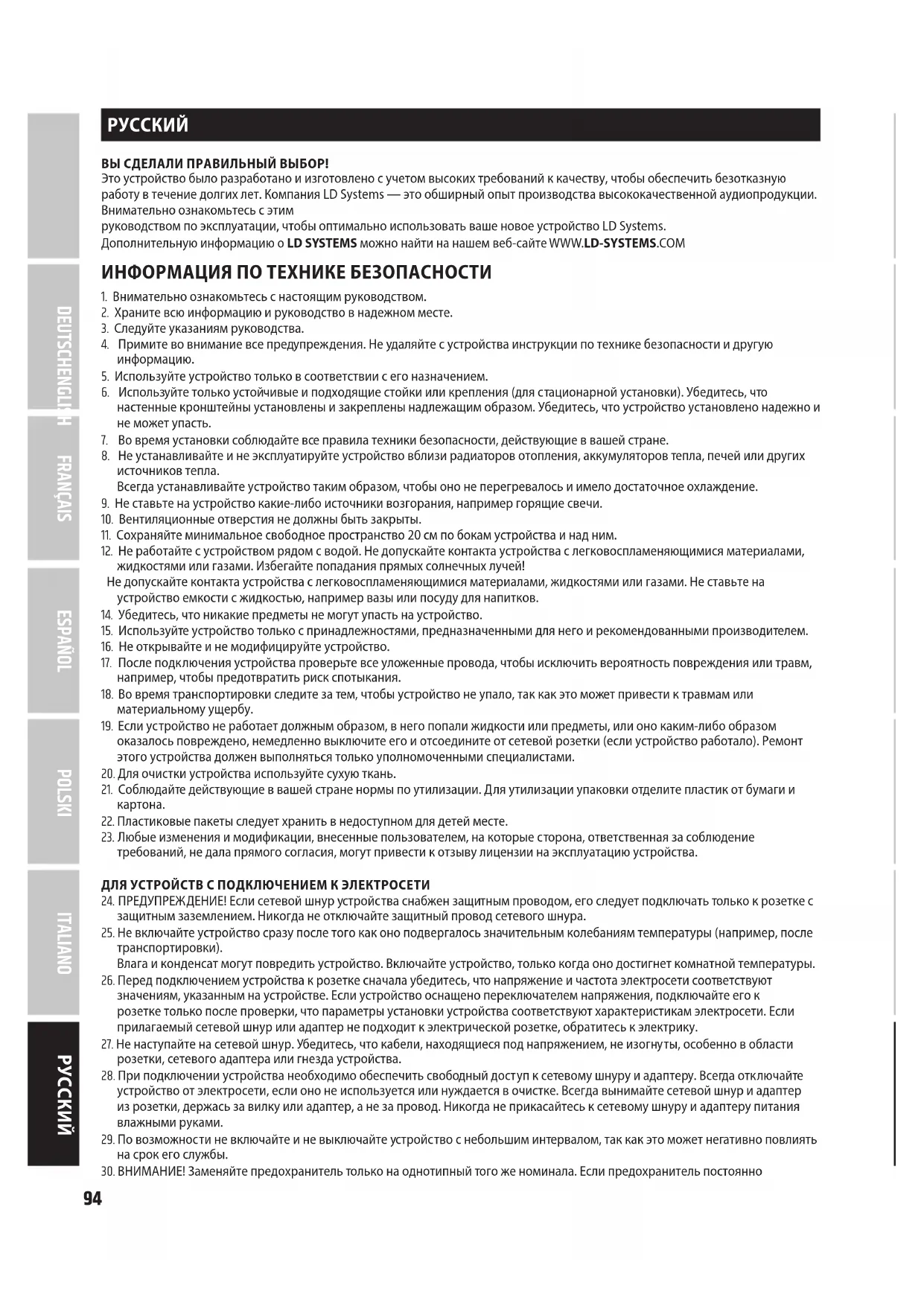 ВЫ СДЕЛАЛИ ПРАВИЛЬНЫЙ ВЫБОР! Это устройство было разработано и изготовлено с учетом высоких требований к качеству, чтобы обеспечить безотказную работу в течение долгих лет. Компания LD Systems — это обширный опыт производства высококачественной аудиопродукции. Внимательно ознакомьтесь с этим руководством по эксплуатации, чтобы оптимально использовать ваше новое устройство LD Systems. Дополнительную информацию о LD SYSTEMS можно найти на нашем веб-сайте WWW.LD-SYSTEMS.COM ИНФОРМАЦИЯ ПО ТЕХНИКЕ БЕЗОПАСНОСТИ