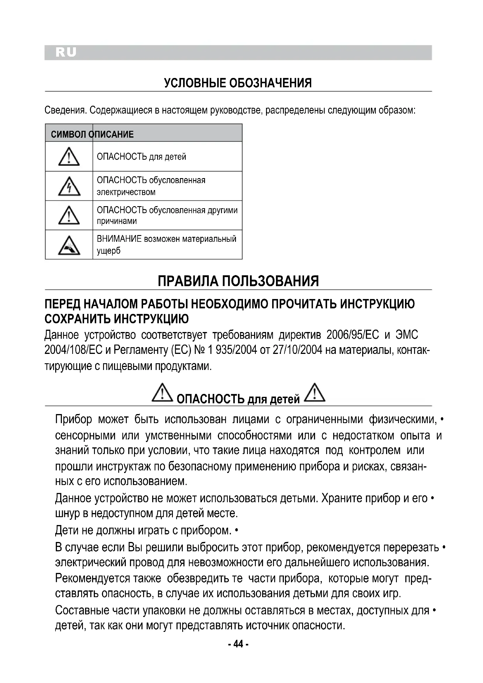 ПРАВИЛА ПОЛЬЗОВАНИЯ ПЕРЕД НАЧАЛОМ РАБОТЫ НЕОБХОДИМО ПРОЧИТАТЬ ИНсТРУКЦИЮ сОХРАНИТЬ ИНсТРУКЦИЮ Данное устройство соответствует требованиям директив 2006/95/EC и ЭМС 2004/108/EC и Регламенту (ЕС) № 1 935/2004 от 27/10/2004 на материалы, контак- тирующие с пищевыми продуктами. ОПАсНОсТЬ для детей Прибор может быть использован лицами с ограниченными физическими, • сенсорными или умственными способностями или с недостатком опыта и знаний только при условии, что такие лица находятся под контролем или прошли инструктаж по безопасному применению прибора и рисках, связан- ных с его использованием. Данное устройство не может использоваться детьми. Храните прибор и его • шнур в недоступном для детей месте. Дети не должны играть с прибором. • В случае если Вы решили выбросить этот прибор, рекомендуется перерезать • электрический провод для невозможности его дальнейшего использования. Рекомендуется также обезвредить те части прибора, которые могут пред- ставлять опасность, в случае их использования детьми для своих игр. Составные части упаковки не должны оставляться в местах, доступных для • детей, так как они могут представлять источник опасности.RU