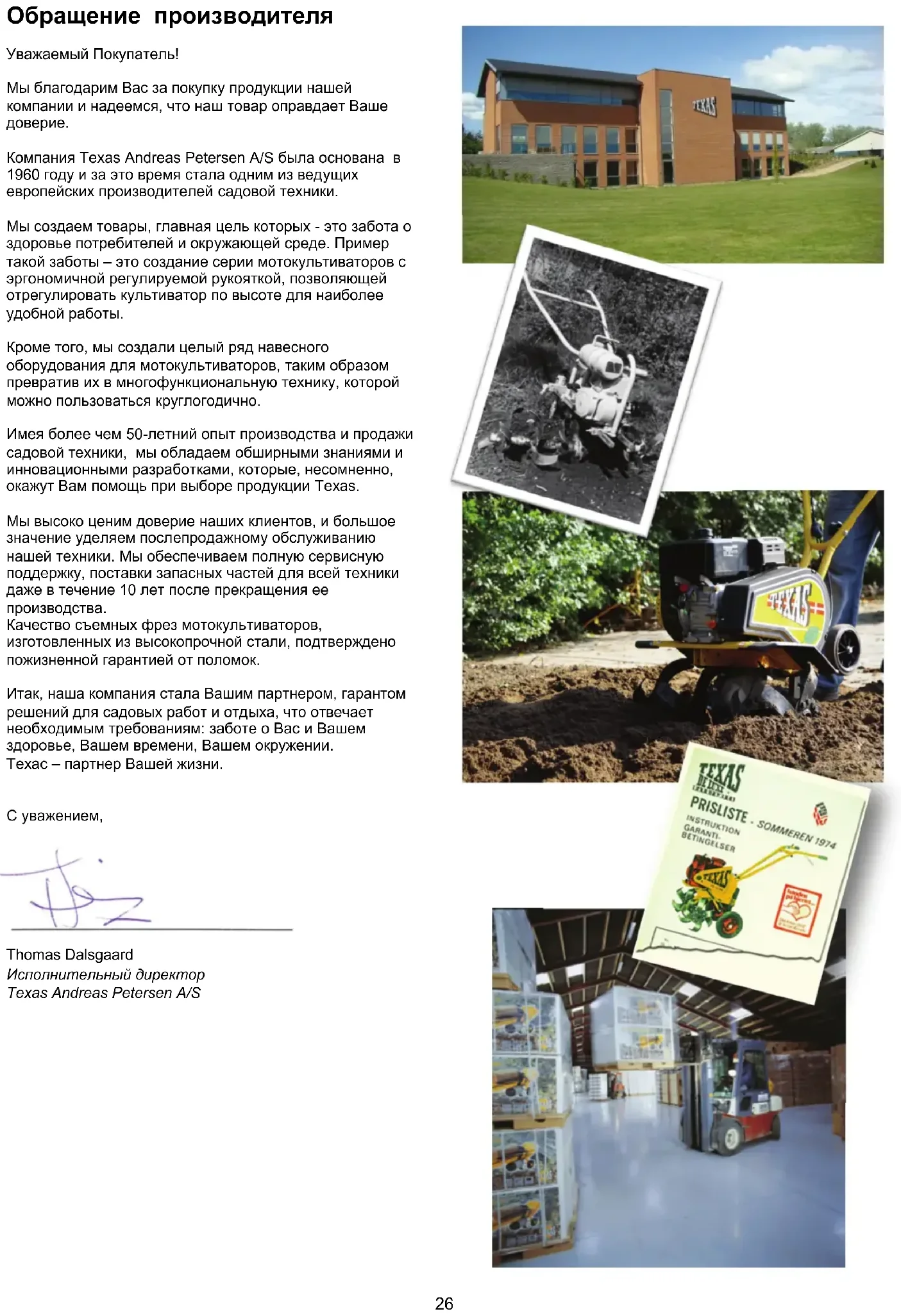 Компания Texas Andreas Petersen A/S была основана в 1960 году и за это время стала одним из ведущих европейских производителей садовой техники. Мы создаем товары, главная цель которых - это забота о здоровье потребителей и окружающей среде. Пример такой заботы – это создание серии мотокультиваторов с эргономичной регулируемой рукояткой, позволяющей отрегулировать культиватор по высоте для наиболее удобной работы. Кроме того, мы создали целый ряд навесного оборудования для мотокультиваторов, таким образом превратив их в многофункциональную технику, которой можно пользоваться круглогодично. Имея более чем 50-летний опыт производства и продажи садовой техники, мы обладаем обширными знаниями и инновационными разработками, которые, несомненно, окажут Вам помощь при выборе продукции Texas. Мы высоко ценим доверие наших клиентов, и большое значение уделяем послепродажному обслуживанию нашей техники. Мы обеспечиваем полную сервисную поддержку, поставки запасных частей для всей техники даже в течение 10 лет после прекращения ее производства. Качество съемных фрез мотокультиваторов, изготовленных из высокопрочной стали, подтверждено пожизненной гарантией от поломок. Итак, наша компания стала Вашим партнером, гарантом решений для садовых работ и отдыха, что отвечает необходимым требованиям: заботе о Вас и Вашем здоровье, Вашем времени, Вашем окружении. Техас – партнер Вашей жизни.