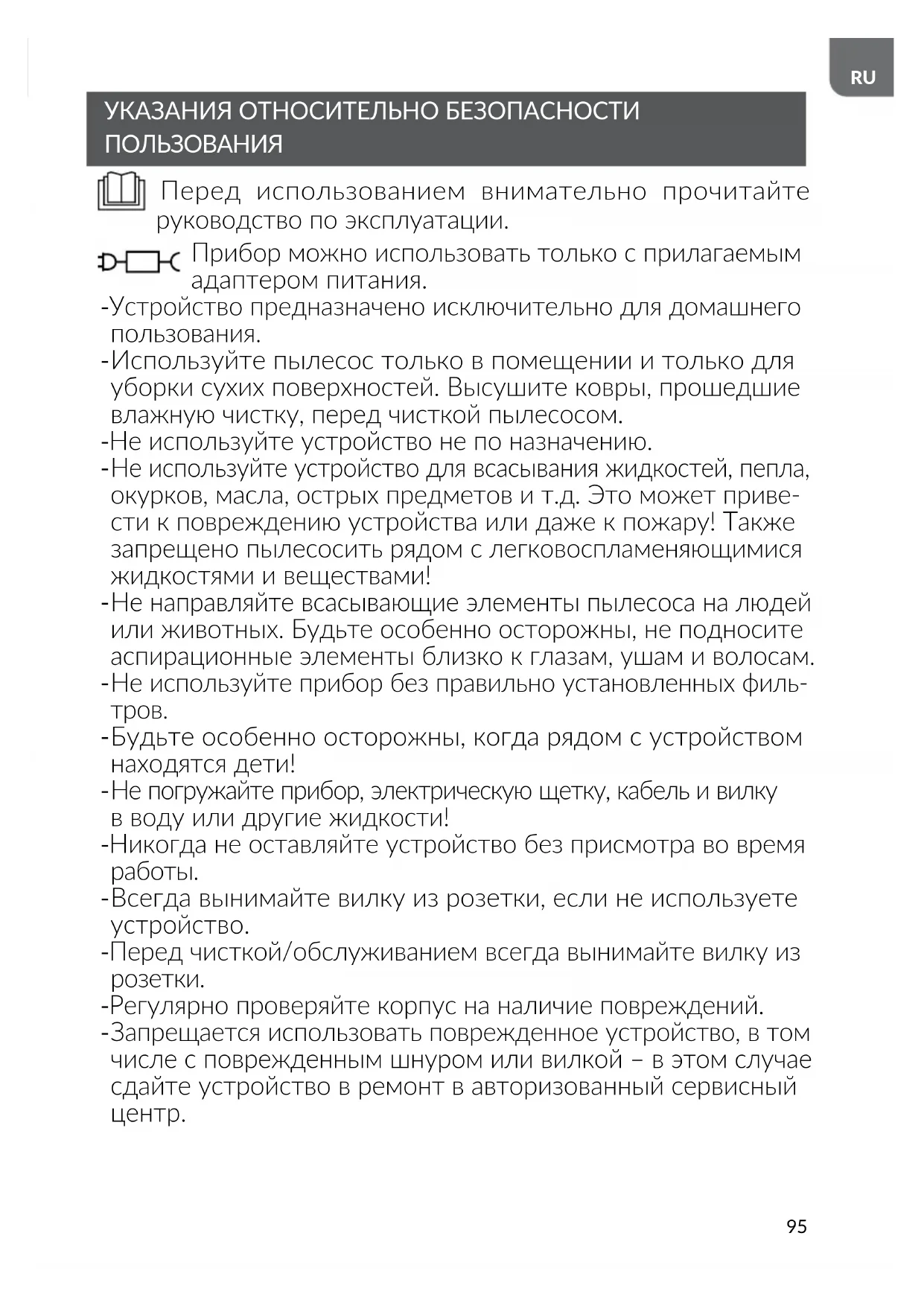 Запрещается использовать поврежденное устройство, в том числе с поврежденным шнуром или вилкой – в этом случае сдайте устройство в ремонт в авторизованный сервисный центр.96