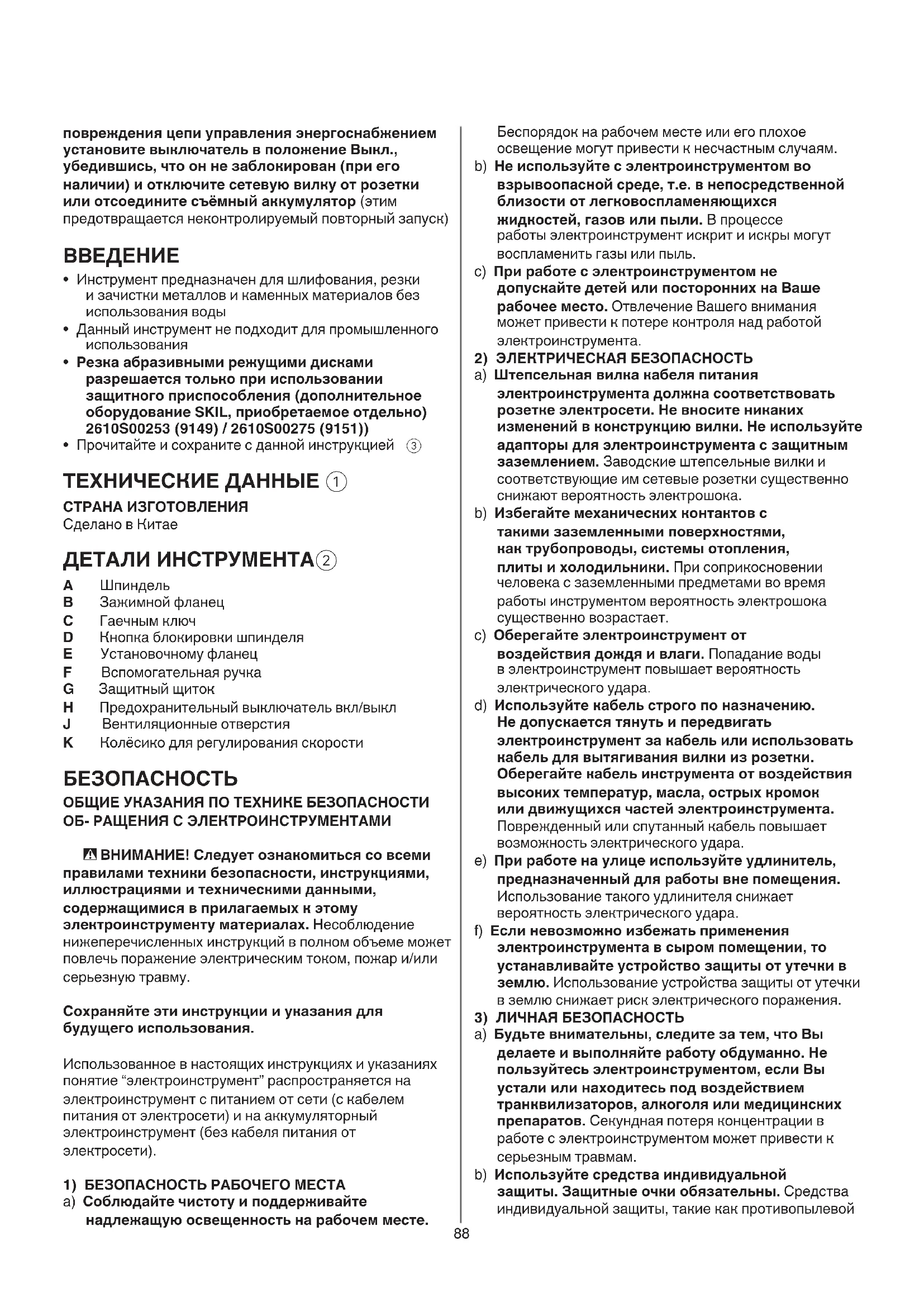 - Резка абразивными режущими дисками разрешается только при использовании защитного приспособления (дополнительное оборудование SKIL, приобретаемое отдельно) 2610S00253 (9149) / 2610S00275 (9151))
