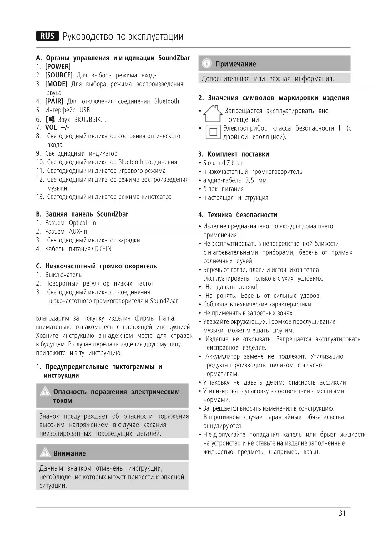 низкочастотногогромкоговорителя иSoundZbar Благодарим за покупку изделия фирмы Hama. внимательно ознакомьтесь снастоящей инструкцией. Храните инструкцию внадежном месте для справок вбудущем. Вслучае передачи изделия другому лицу приложите иэту инструкцию.