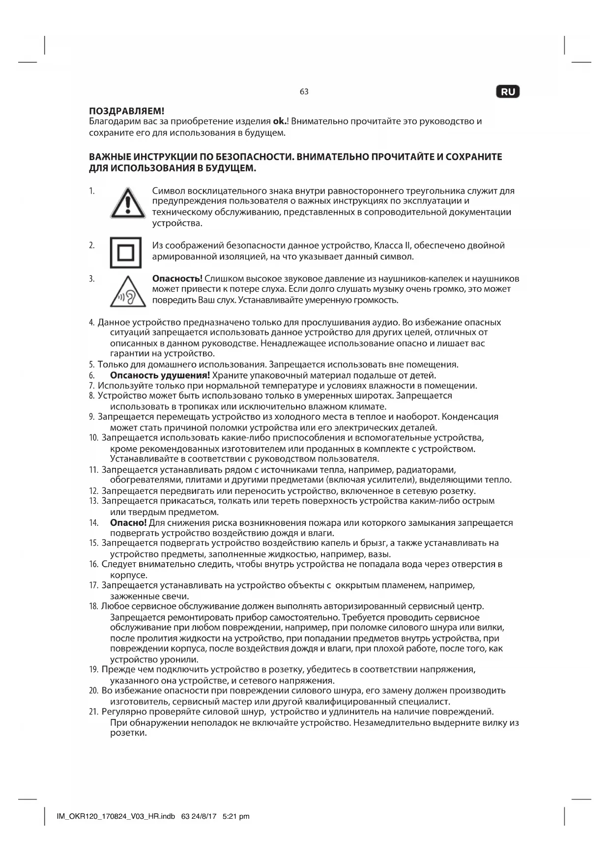 Данное изделие предназначено для воспроизведения радиопередач. Любое иное использование может вызывать повреждение изделия или травмы. Это изделие предназначено только для домашнего использования и не подходит для коммерческого применения. Imtron GmbH не несет никакой ответственности за повреждение изделия, ущерб имуществу или травмы вследствие халатного отношения или использования изделия не по назначению, или использования изделия, не отвечающего определенным производителям целям. IM_OKR120_170824_V03_HR.indb 64 24/8/17 5:21 pm65