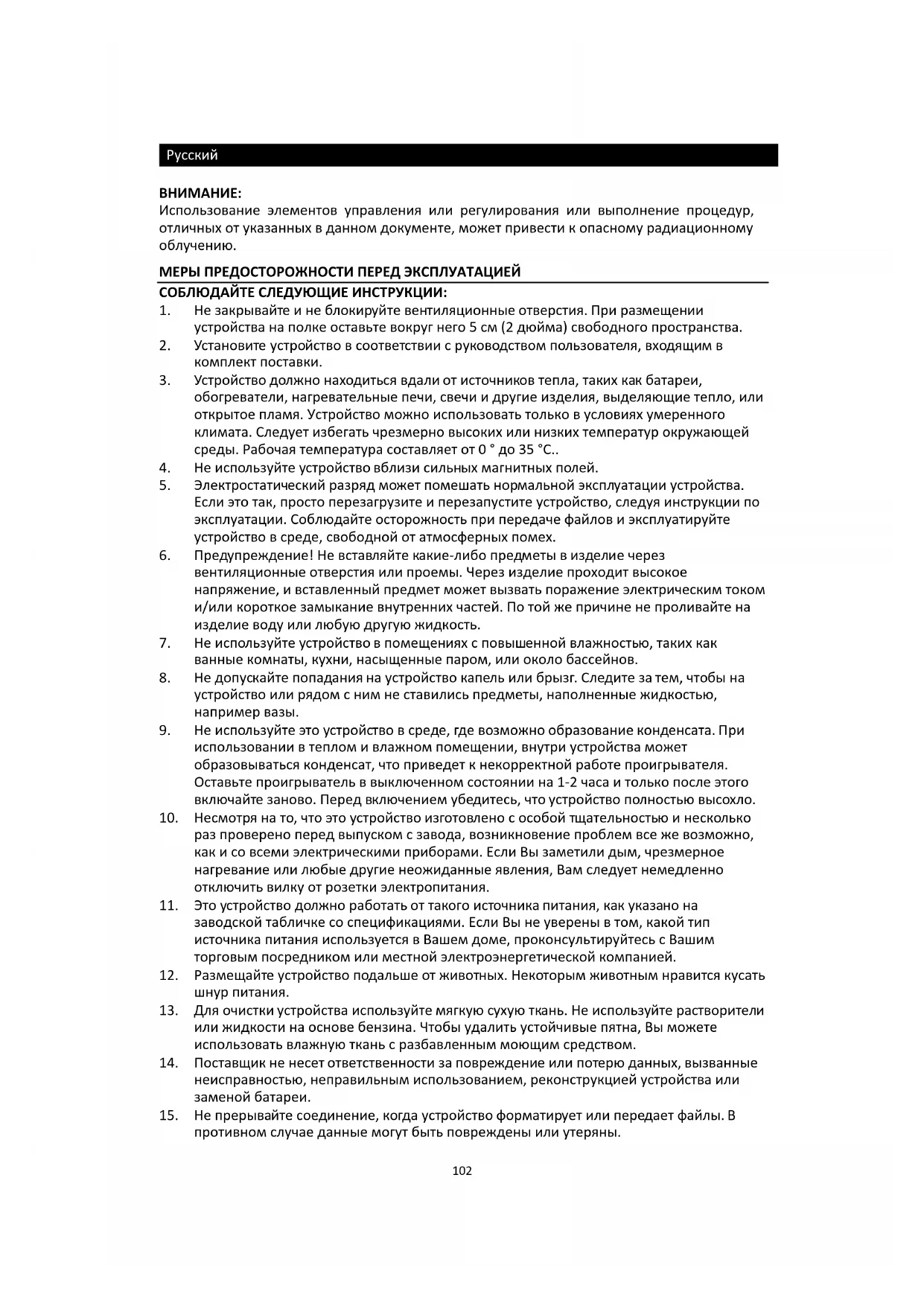 3. Устройство должно находиться вдали от источников тепла, таких как батареи,