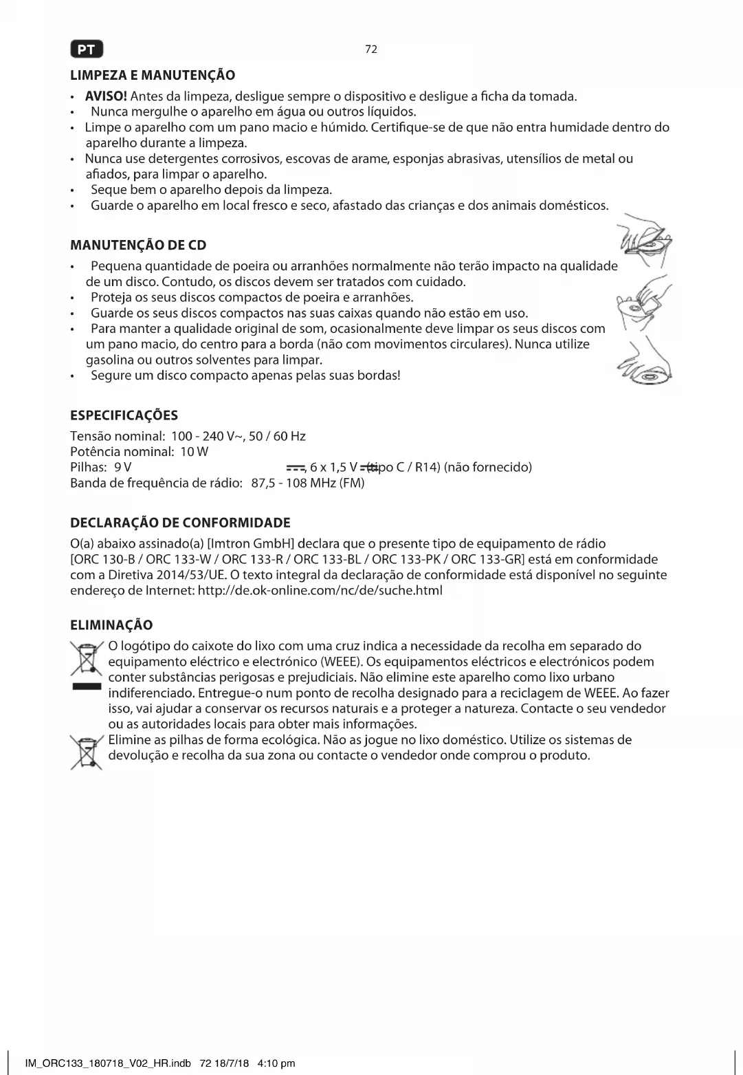 - Держите компакт-диски только за края! ХАРАКТЕРИСТИКИ Номинальное напряжение: 100 - 240 V~, 50 / 60 Hz Номинальная мощность: 10 W Батарейка: 9 V , 6 x 1.5 V (тип C / R14) (не входит в комплект поставки) Диапазон радиочастот: 87.5 - 108 MHz (FM) ДЕКЛАРАЦИЯ СООТВЕТСТВИЯ Компания [Imtron GmbH] настоящим заявляет, что радиооборудование типа [ORC 130-B / ORC 133-W / ORC 133-R / ORC 133-BL / ORC 133-PK / ORC 133-GR] отвечает требованиям Директивы 2014/53/EU. Полный текст декларации соответствия ЕС доступен в Интернете по следующей ссылке: http://de.ok-online.com/nc/de/suche.html