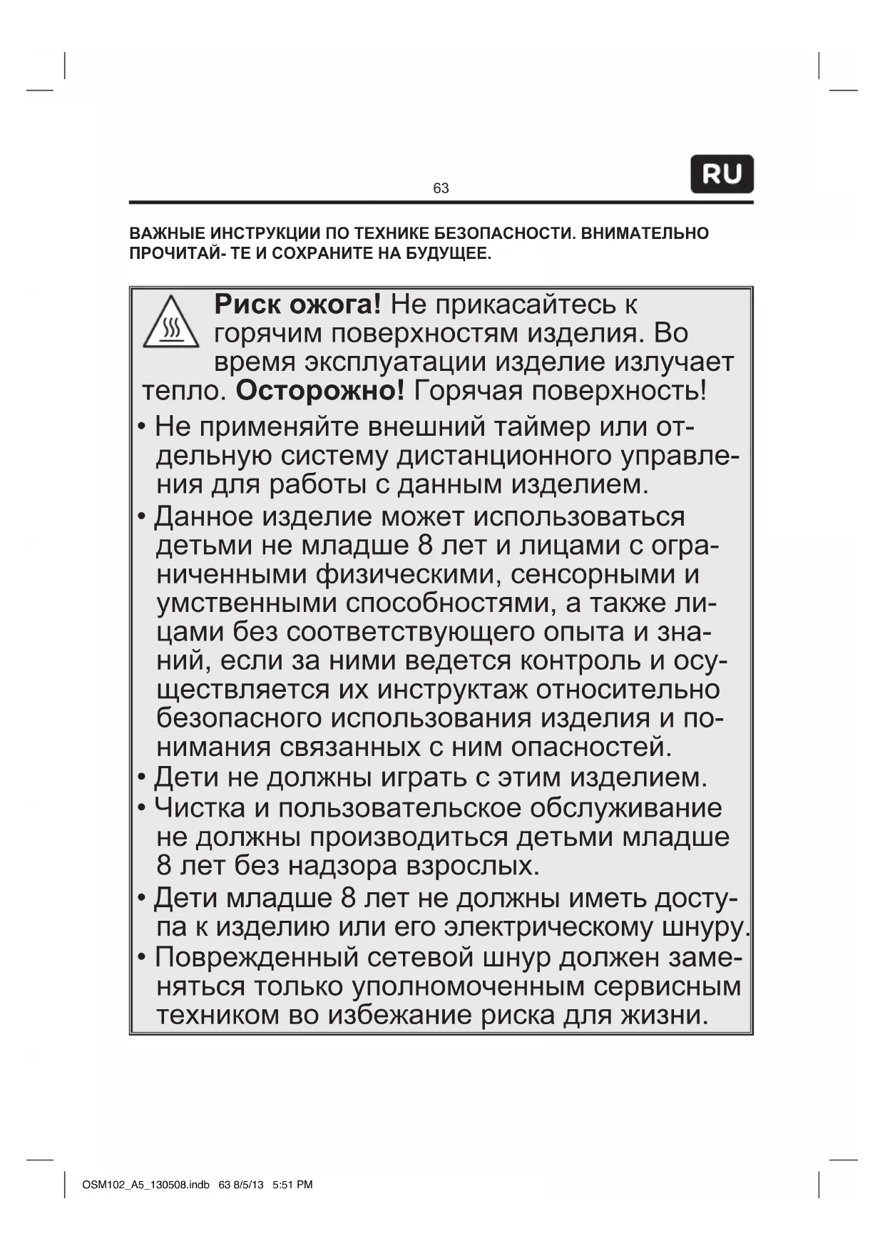 Не следует выбрасывать прибор вместе с бытовыми отходами. Верните его в специализированный пункт приема электронного и электрооборудования на утилизацию. За более подробной информацией обратитесь к Вашему продавцу или местным властям. OSM102_A5_130508.indb 68 8/5/13 5:51 PM69 Size - A5 VIKTIGA SÄKERHETSINSTRUKTIONER. LÄS IGENOM NOGA OCH SPARA FÖR FRAMTIDA ANVÄNDNING. Risk för brännskador! Rör inte vid de heta ytorna. Produkten avger värme vid användning. Varning! Het yta!