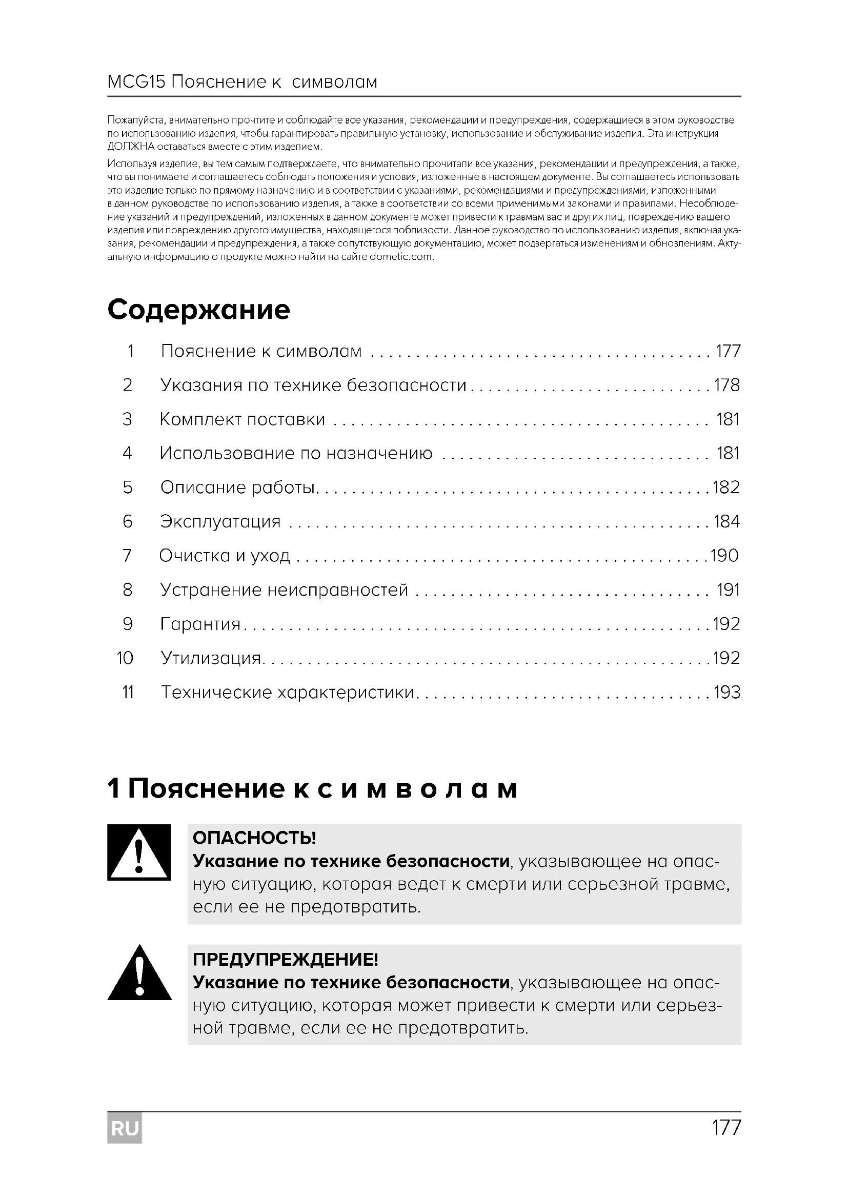 Указание по технике безопасности, указывающее на опас- ную ситуацию, которая ведет ксмерти или серьезной травме, если ее не предотвратить. ПРЕДУПРЕЖДЕНИЕ! Указание по технике безопасности, указывающее на опас- ную ситуацию, которая может привести ксмерти или серьез- ной травме, если ее не предотвратить. MobicoolMCG15_OPM_4445103306_EMEA16_202x-xx-xx.book Seite 177 Freitag, 16. April 2021 2:17 14RU Указания по технике безопасности MCG15