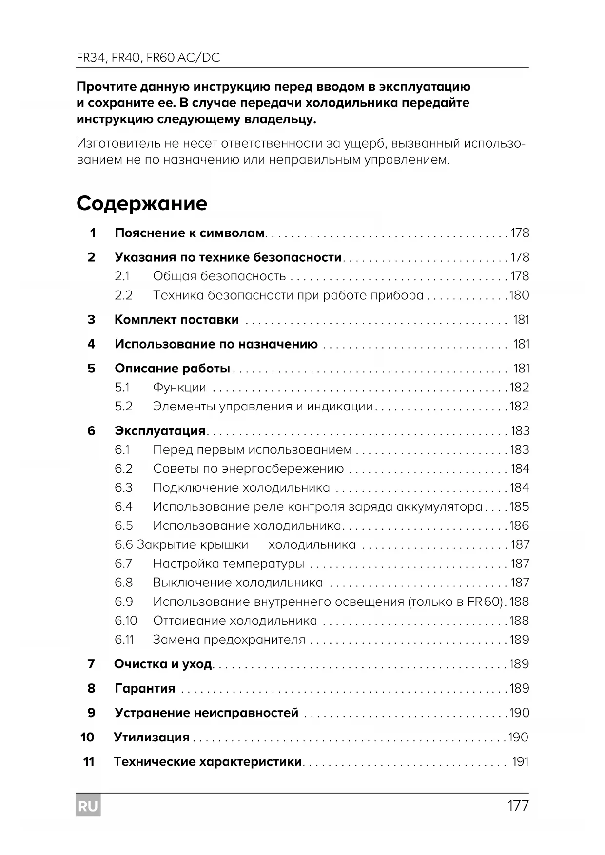 Отсоедините холодильник и другие потребители от аккуму- ляторной батареи, прежде чем присоединить устройство для ускоренного заряда. FR34-FR40-FR60--O-16s.book Seite 179 Donnerstag, 19. Juli 2018 3:22 15RU Указания по технике безопасности FR34, FR40, FR60 AC/DC