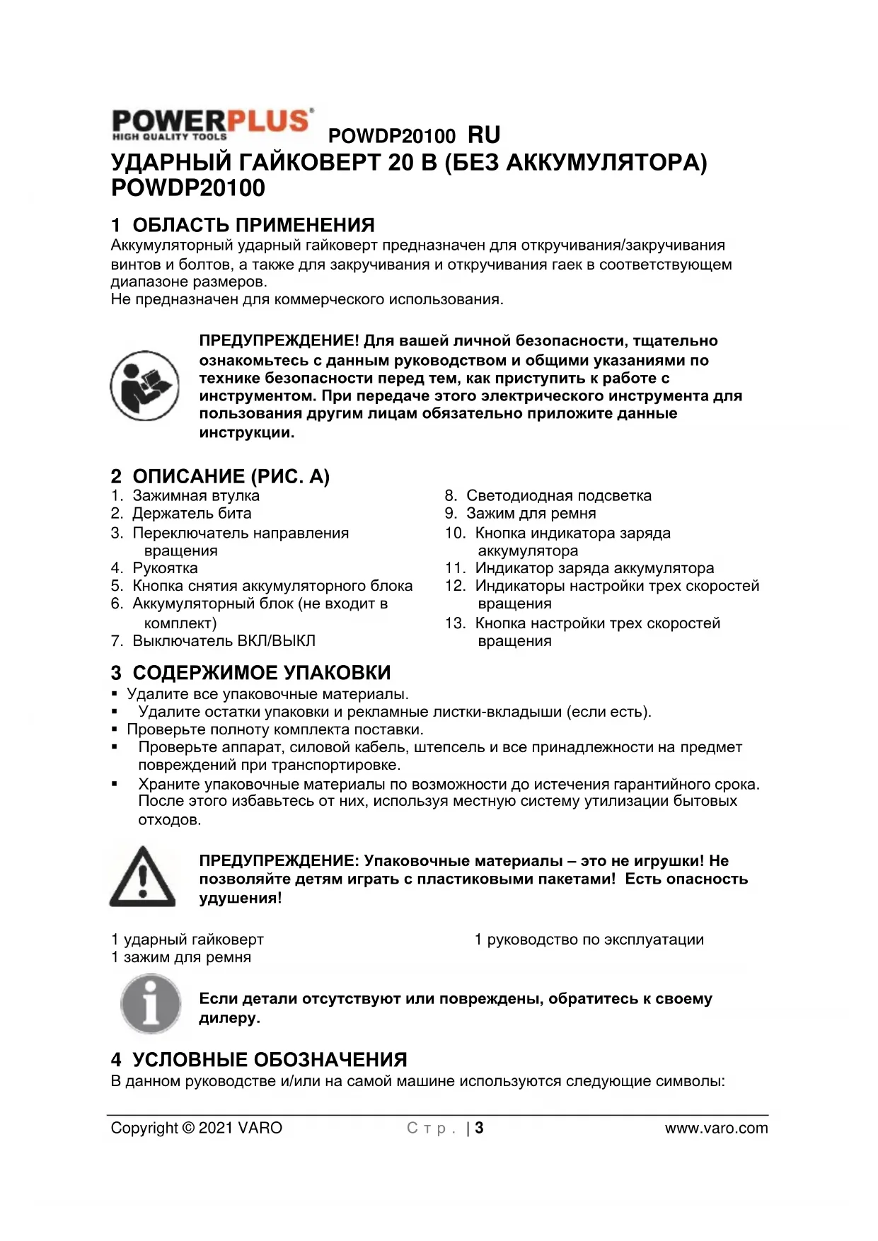 - 15 ДЕКЛАРАЦИЯ О СООТВЕТСТВИИ POWDP20100 RU Copyright © 2021 VARO С т р . | 3 www.varo.com УДАРНЫЙ ГАЙКОВЕРТ 20 В (БЕЗ АККУМУЛЯТОРА) POWDP20100 1 ОБЛАСТЬ ПРИМЕНЕНИЯ Аккумуляторный ударный гайковерт предназначен для откручивания/закручивания винтов и болтов, а также для закручивания и откручивания гаек в соответствующем диапазоне размеров. Не предназначен для коммерческого использования. ПРЕДУПРЕЖДЕНИЕ! Для вашей личной безопасности, тщательно ознакомьтесь с данным руководством и общими указаниями по технике безопасности перед тем, как приступить к работе с инструментом. При передаче этого электрического инструмента для пользования другим лицам обязательно приложите данные инструкции. 2 ОПИСАНИЕ (РИС. А) p. 15