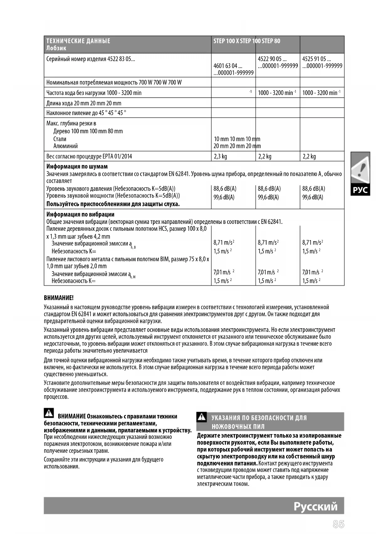 ВНИМАНИЕ Ознакомьтесь с правилами техники безопасности, техническими регламентами, изображениями и данными, прилагаемыми к устройству. При несоблюдении нижеследующих указаний возможно поражения электротоком, возникновение пожара и/или получение серьезных травм. Сохраняйте эти инструкции и указания для будущего использования. УКАЗАНИЯ ПО БЕЗОПАСНОСТИ ДЛЯ НОЖОВОЧНЫХ ПИЛ Держите электроинструмент только за изолированные поверхности рукояток, если Вы выполняете работы, при которых рабочий инструмент может попасть на скрытую электропроводку или на собственный шнур подключения питания. К онтакт режущего инструмента с токоведущим проводом может ставить под напряжение металлические части прибора, а также приводить к удару электрическим током. РУС8686 Pусский Используйте тиски или другой удобный способ для обеспечения фиксации и поддержки обрабатываемого изделия на устойчивой платформе. Производя работу на руках или на весу, вы можете потерять контроль. Пользуйтесь приспособлениями для защиты слуха. Воздействие шума может привести к потере слуха. Дополнительные указания по безопасности и работе Пользоваться средствами защиты. Работать с инструментом всегда в защитных очках. Рекомендуется спецодежда пылезащитная маска, защитные перчатки, прочная и нескользящая обувь, каска и наушники. Пыль, образующаяся при работе с данным инструментом, может быть вредна для здоровья и попасть на тело. Пользуйтесь системой пылеудаления и надевайте подходящую защитную маску. Тщательно убирайте скапливающуюся пыль (напр. пылесосом). Запрещается обрабатывать материалы, которые могут нанести вред здоровью (напр., асбест). При блокировании используемого инструмента немедленно выключить прибор! Не включайте прибор до тех пор, пока используемый инструмент заблокирован, в противном случае может возникнуть отдача с высоким реактивным моментом. Определите и устраните причину блокирования используемого инструмента с учетом указаний по безопасности. Возможными причинами остановки могут быть: