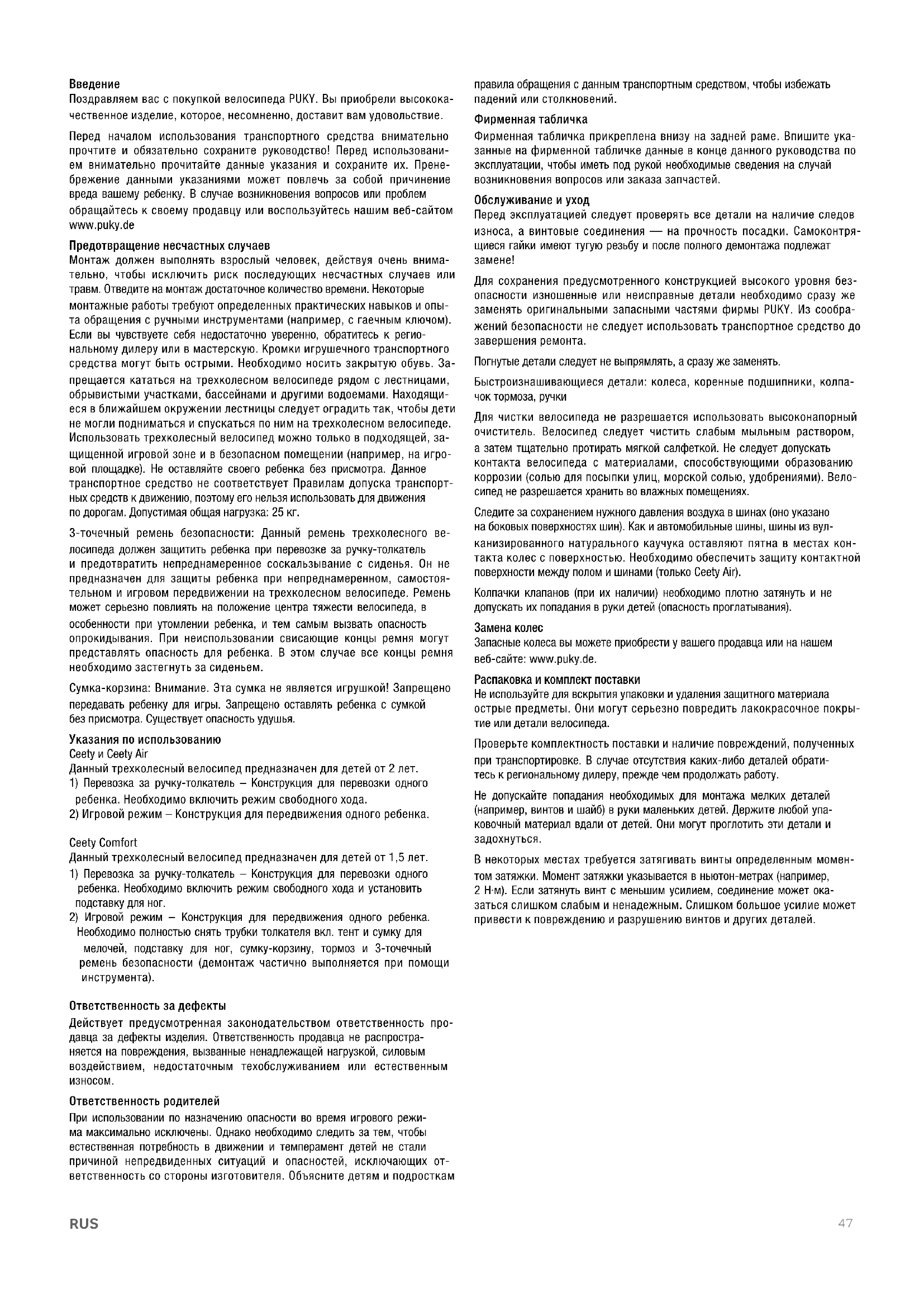 Поздравляем вас с покупкой велосипеда PUKY. Вы приобрели высокока- чественное изделие, которое, несомненно, доставит вам удовольствие. Перед началом использования транспортного средства внимательно прочтите и обязательно сохраните руководство! Перед использовани- ем внимательно прочитайте данные указания и сохраните их. Прене- брежение данными указаниями может повлечь за собой причинение вреда вашему ребенку. В случае возникновения вопросов или проблем обращайтесь к своему продавцу или воспользуйтесь нашим веб-сайтом www.puky.de Предотвращение несчастных случаев Монтаж должен выполнять взрослый человек, действуя очень внима- тельно, чтобы исключить риск последующих несчастных случаев или травм. Отведите на монтаж достаточное количество времени. Некоторые монтажные работы требуют определенных практических навыков и опы- та обращения с ручными инструментами (например, с гаечным ключом). Если вы чувствуете себя недостаточно уверенно, обратитесь к регио- нальному дилеру или в мастерскую. Кромки игрушечного транспортного средства могут быть острыми. Необходимо носить закрытую обувь. За- прещается кататься на трехколесном велосипеде рядом с лестницами, обрывистыми участками, бассейнами и другими водоемами. Находящи- еся в ближайшем окружении лестницы следует оградить так, чтобы дети не могли подниматься и спускаться по ним на трехколесном велосипеде. Использовать трехколесный велосипед можно только в подходящей, за- щищенной игровой зоне и в безопасном помещении (например, на игро- вой площадке). Не оставляйте своего ребенка без присмотра. Данное транспортное средство не соответствует Правилам допуска транспорт- ных средств к движению, поэтому его нельзя использовать для движения по дорогам. Допустимая общая нагрузка: 25 кг. 3-точечный ремень безопасности: Данный ремень трехколесного ве- лосипеда должен защитить ребенка при перевозке за ручку-толкатель и предотвратить непреднамеренное соскальзывание с сиденья. Он не предназначен для защиты ребенка при непреднамеренном, самостоя- тельном и игровом передвижении на трехколесном велосипеде. Ремень может серьезно повлиять на положение центра тяжести велосипеда, в особенности при утомлении ребенка, и тем самым вызвать опасность опрокидывания. При неиспользовании свисающие концы ремня могут представлять опасность для ребенка. В этом случае все концы ремня необходимо застегнуть за сиденьем. Сумка-корзина: Внимание. Эта сумка не является игрушкой! Запрещено передавать ребенку для игры. Запрещено оставлять ребенка с сумкой без присмотра. Существует опасность удушья. Указания по использованию Ceety и Ceety Air Данный трехколесный велосипед предназначен для детей от 2 лет.