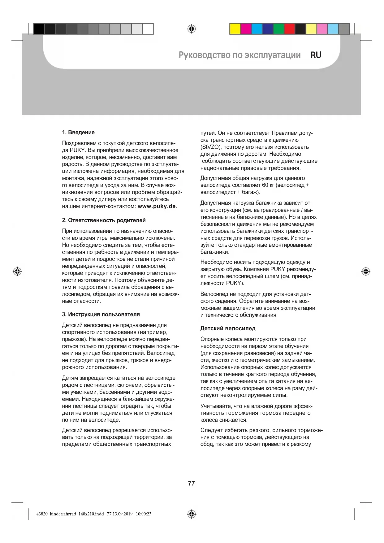 Поздравляем с покупкой детского велосипе- да PUKY. Вы приобрели высококачественное изделие, которое, несомненно, доставит вам радость. В данном руководстве по эксплуата- ции изложена информация, необходимая для монтажа, надежной эксплуатации этого ново- го велосипеда и ухода за ним. В случае воз- никновения вопросов или проблем обращай- тесь к своему дилеру или воспользуйтесь нашим интернет-контактом: www.puky.de.