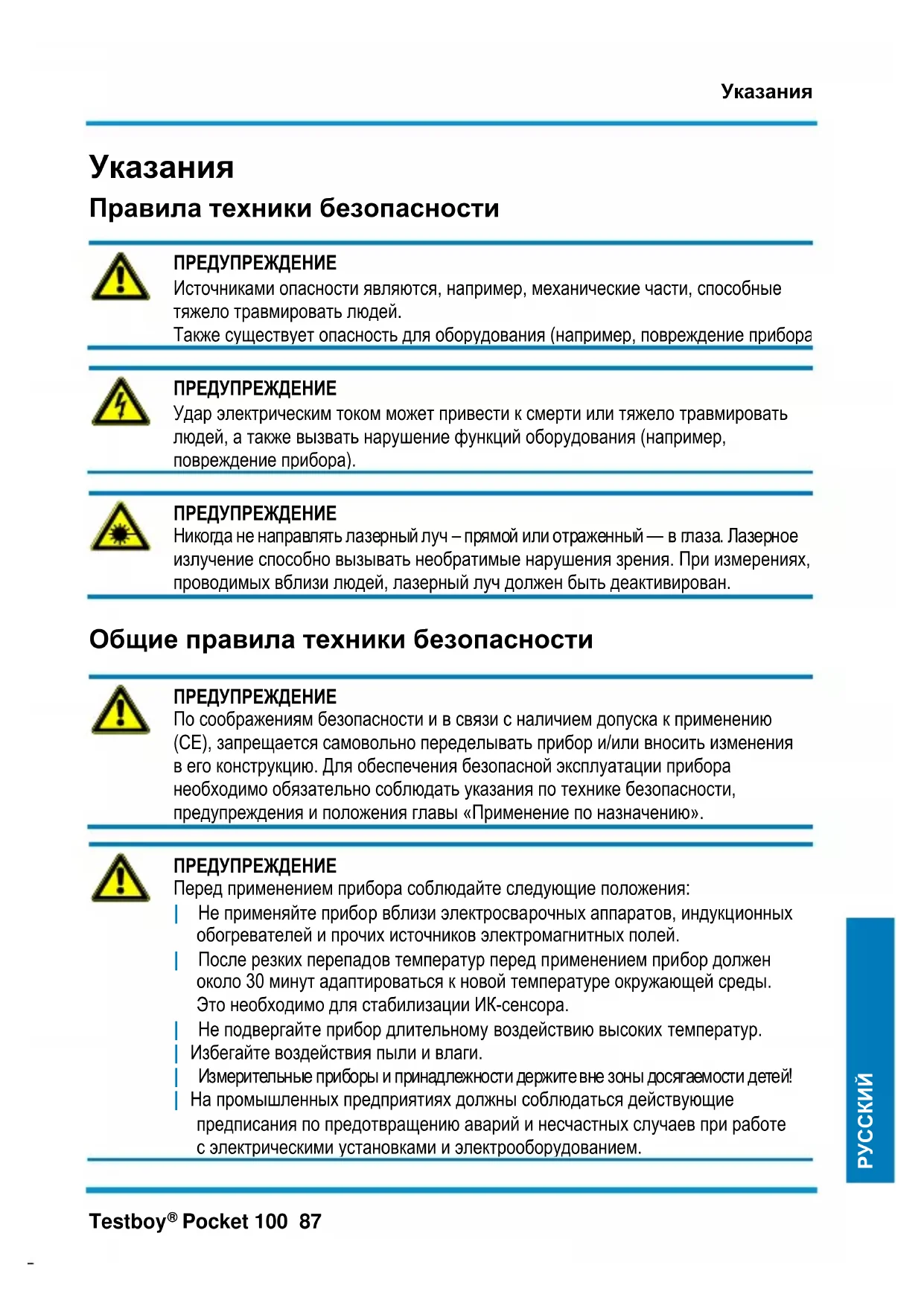 ПРЕДУПРЕЖДЕНИЕ Перед применением прибора соблюдайте следующие положения: | Не применяйте прибор вблизи электросварочных аппаратов, индукционных обогревателей и прочих источников электромагнитных полей. | После резких перепадов температур перед применением прибор должен около 30 минут адаптироваться к новой температуре окружающей среды. Это необходимо для стабилизации ИК-сенсора. | Не подвергайте прибор длительному воздействию высоких температур. | Избегайте воздействия пыли и влаги. | Измерительные приборы и принадлежности держите вне зоны досягаемости детей! | На промышленных предприятиях должны соблюдаться действующие предписания по предотвращению аварий и несчастных случаев при работе с электрическими установками и электрооборудованием.Указания 88 Testboy