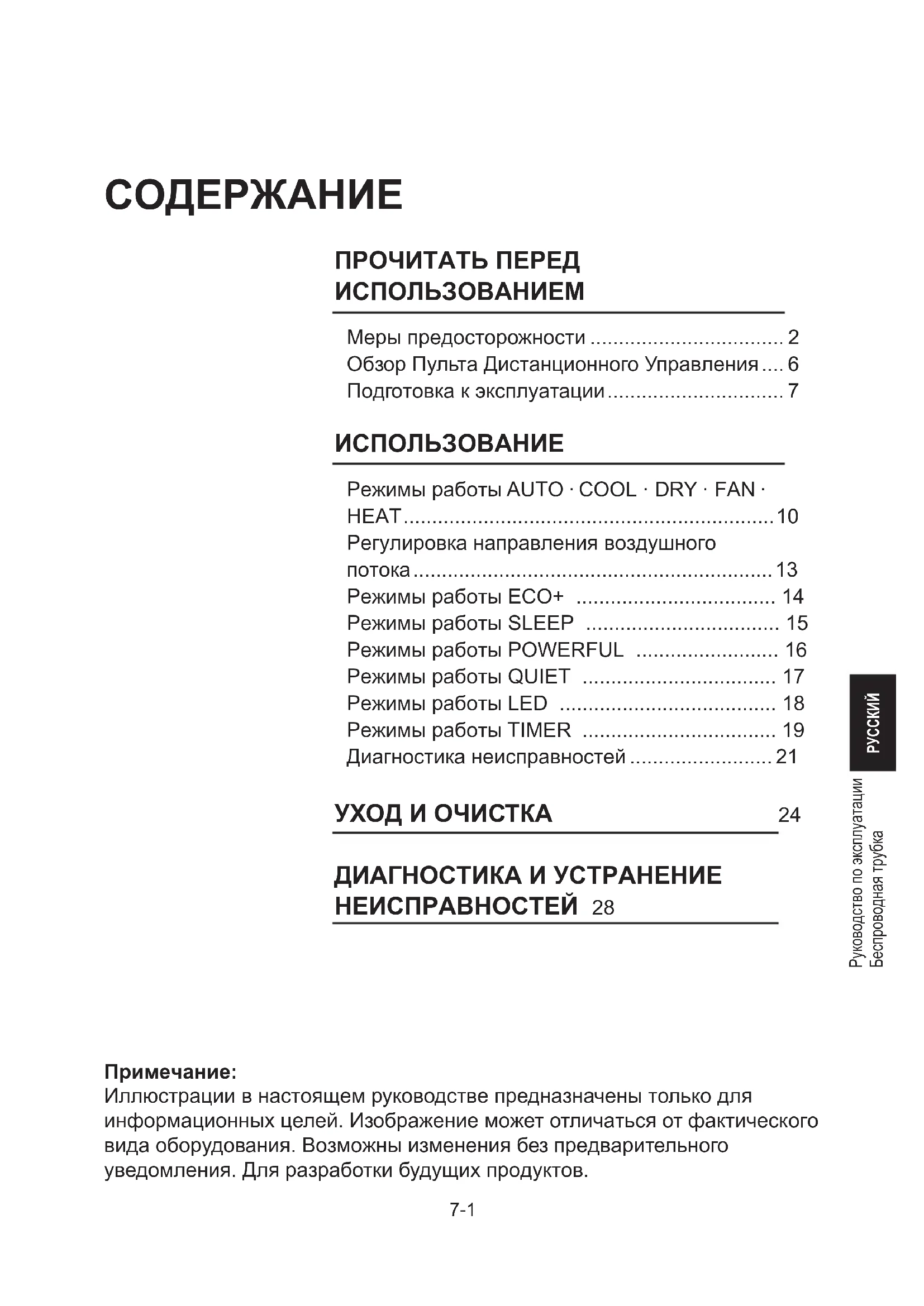 ПРОЧИТАТЬ ПЕРЕД ИСПОЛЬЗОВАНИЕМ Меры предосторожности .................................. 2 Обзор Пульта Дистанционного Управления .... 6 Подготовка к эксплуатации ............................... 7 ИСПОЛЬЗОВАНИЕ Режимы работы AUTO