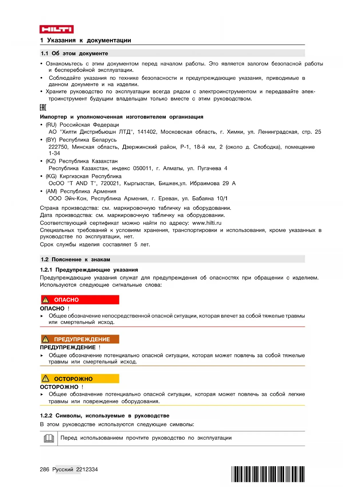 - (AM) Республика Армения ООО Эйч-Кон, Республика Армения, г. Ереван, ул. Бабаяна 10/1 Страна производства: см. маркировочную табличку на оборудовании. Дата производства: см. маркировочную табличку на оборудовании. Соответствующий сертификат можно найти по адресу: www.hilti.ru Специальных требований к условиям хранения, транспортировки и использования, кроме указанных в руководстве по эксплуатации, нет. Срок службы изделия составляет 5 лет.
