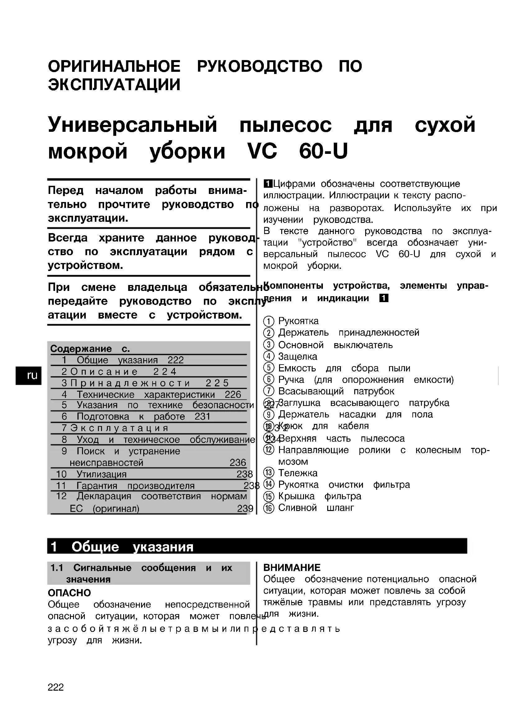 Printed: 05.12.2013 | Doc-Nr: PUB / 5071295 / 000 / 02ОРИГИНАЛЬНОЕ РУКОВОДСТВО ПО ЭКСПЛУАТАЦИИ Универсальный пылесос для сухой и мокрой уборки VC 60‑U Перед началом работы внима-тельно прочтите руководство поэксплуатации.Всегда храните данное руковод-ство по эксплуатации рядом сустройством.При смене владельца обязательнопередайте руководство по эксплу-атации вместе с устройством.Содержание с.1 Общие указания 2222Описание 2243Принадлежности 2254 Технические характеристики 2265 Указания по технике безопасности 2276 Подготовка к работе 2317Эксплуатация 2328 Уход и техническое обслуживание 2349 Поиск и устранениенеисправностей 23610 Утилизация 23811 Гарантия производителя 23812 Декларация соответствия нормамЕС (оригинал) 2391 Цифрами обозначены соответствующие иллюстрации. Иллюстрации к тексту распо- ложены на разворотах. Используйте их приизучении руководства.В тексте данного руководства по эксплуа-тации "устройство" всегда обозначает уни-версальный пылесос VC 60-U для сухой имокрой уборки.Компоненты устройства, элементы управ-ления и индикации 1