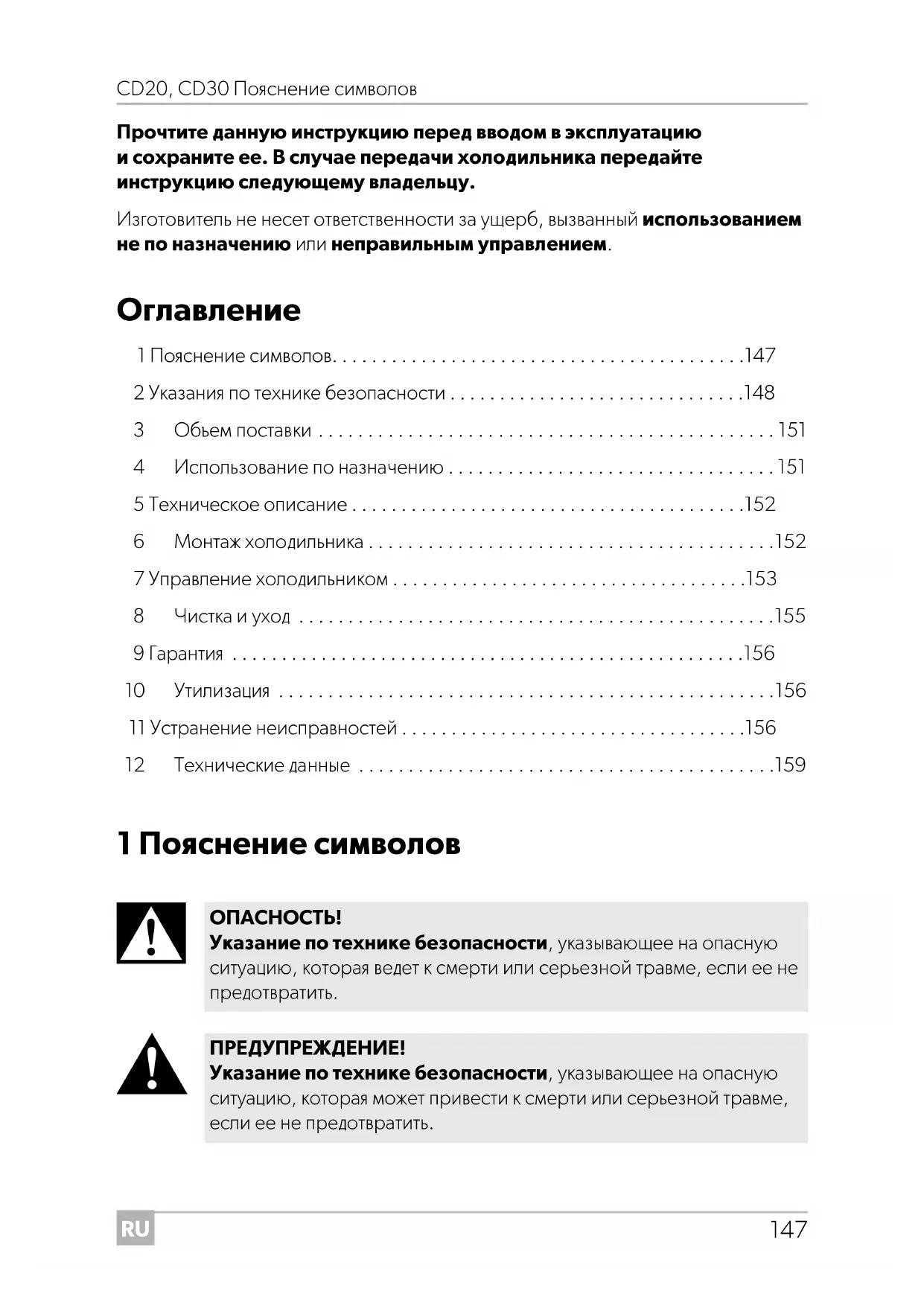 Не используйте для чистки абразивные чистящие средства или острые предметы, т. к. они могут привести к повреждениям холодильника. CD20-30-IO-16s.book Seite 155 Montag, 18. Mai 2020 2:25 14RU Гарантия CD20, CD30