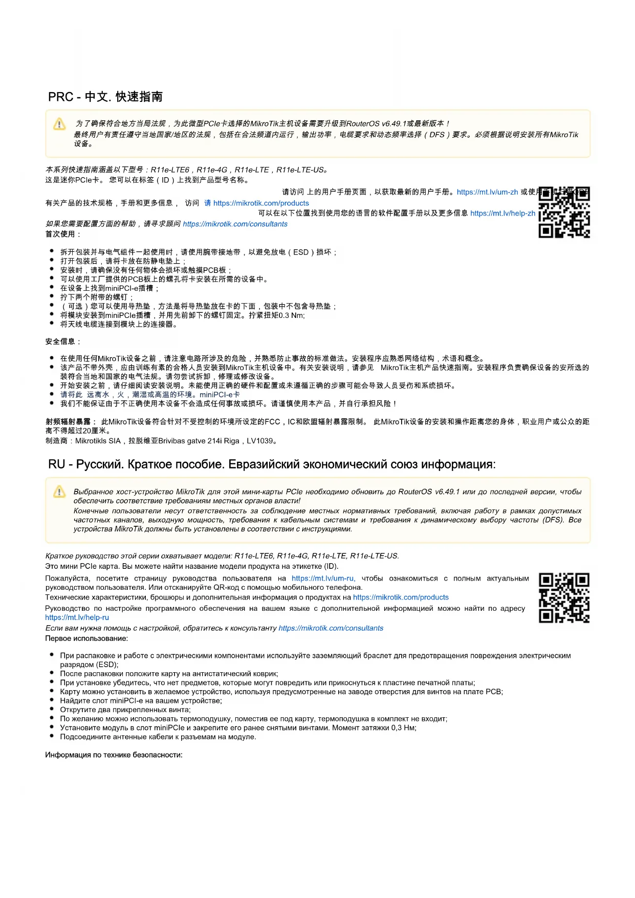 在使用任何MikroTik设备之前,请注意电路所涉及的危险,并熟悉防止事故的标准做法。安装程序应熟悉网络结构,术语和概念。 该产品不带外壳,应由训练有素的合格人员安装到MikroTik主机设备中。有关安装说明,请参见 MikroTik主机产品快速指南。安装程序负责确保设备的安所选的 装符合当地和国家的电气法规。请勿尝试拆卸,修理或修改设备。 开始安装之前,请仔细阅读安装说明。未能使用正确的硬件和配置或未遵循正确的步骤可能会导致人员受伤和系统损坏。 请将此 远离水,火,潮湿或高温的环境。miniPCI-e卡 我们不能保证由于不正确使用本设备不会造成任何事故或损坏。请谨慎使用本产品,并自行承担风险! 此MikroTik设备符合针对不受控制的环境所设定的FCC,IC和欧盟辐射暴露限制。 此MikroTik设备的安装和操作距离您的身体,职业用户或公众的距射频辐射暴露: 离不得超过 厘米。20 制造商:Mikrotikls SIA,拉脱维亚Brivibas gatve 214i Riga,LV1039。 RU - Русский. Краткое пособие. Евразийский экономический союз информация: Краткое руководство этой серии охватывает модели: R11e-LTE6, R11e-4G, R11e-LTE, R11e-LTE-US. Это мини PCIe карта. Вы можете найти название модели продукта на этикетке (ID). Пожалуйста, посетите страницу руководства пользователя на чтобы ознакомиться с полным актуальнымhttps://mt.lv/um-ru, руководством пользователя. Или отсканируйте QR-код с помощью мобильного телефона. Технические характеристики, брошюры и дополнительная информация о продуктах на https://mikrotik.com/products Руководство по настройке программного обеспечения на вашем языке с дополнительной информацией можно найти по адресу https://mt.lv/help-ru Если вам нужна помощь с настройкой, обратитесь к консультанту https://mikrotik.com/consultants Первое использование: При распаковке и работе с электрическими компонентами используйте заземляющий браслет для предотвращения повреждения электрическим разрядом (ESD); После распаковки положите карту на антистатический коврик; При установке убедитесь, что нет предметов, которые могут повредить или прикоснуться к пластине печатной платы; Карту можно установить в желаемое устройство, используя предусмотренные на заводе отверстия для винтов на плате PCB; Найдите слот miniPCI-e на вашем устройстве; Открутите два прикрепленных винта; По желанию можно использовать термоподушку, поместив ее под карту, термоподушка в комплект не входит; Установите модуль в слот miniPCIe и закрепите его ранее снятыми винтами. Момент затяжки 0,3 Нм; Подсоедините антенные кабели к разъемам на модуле. Информация по технике безопасности: 为了确保符合地方当局法规,为此微型PCIe卡选择的MikroTik主机设备需要升级到RouterOS v6.49.1或最新版本! 最终用户有责任遵守当地国家/地区的法规,包括在合法频道内运行,输出功率,电缆要求和动态频率选择(DFS)要求。必须根据说明安装所有MikroTik