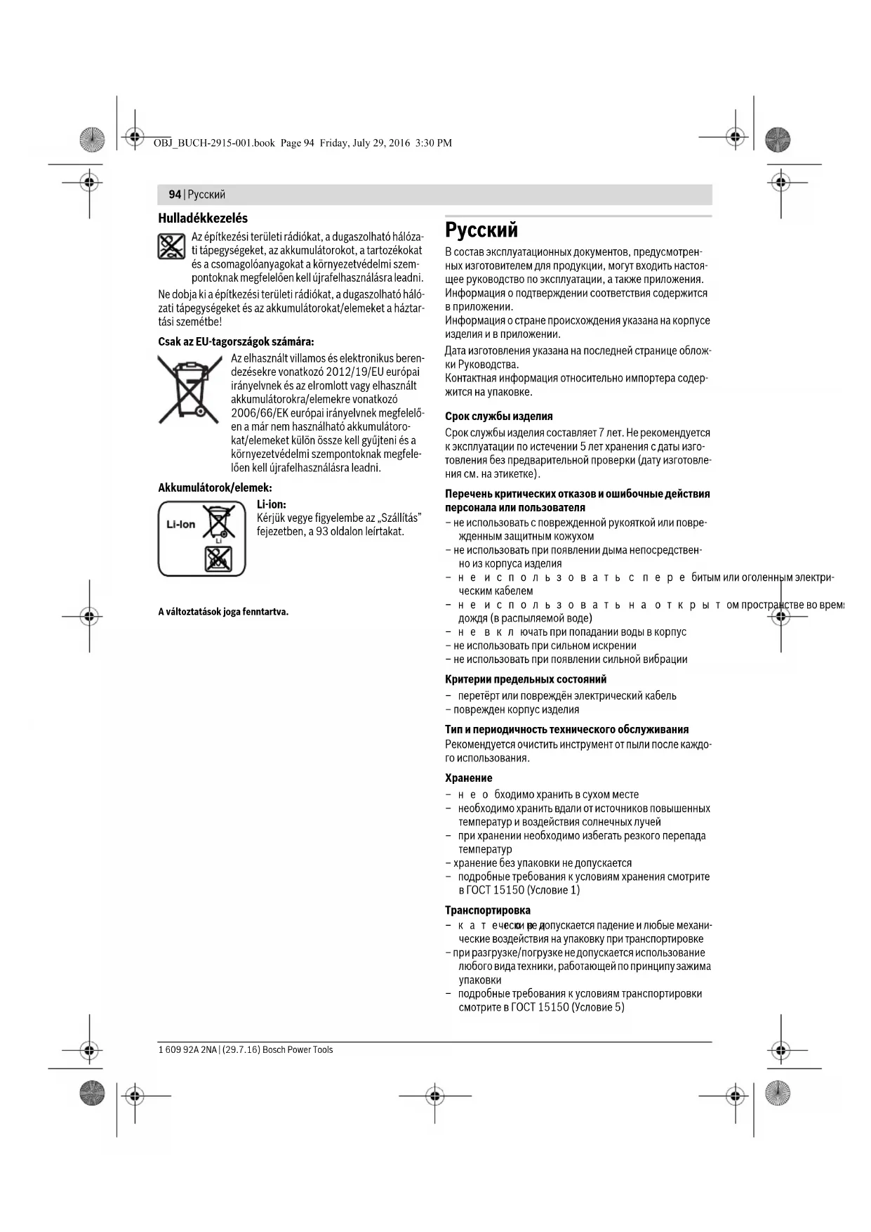 Технические данные определены с аккумуляторной батареей, вхо- дящей в объем поставки. OBJ_BUCH-2915-001.book Page 96 Friday, July 29, 2016 3:30 PMРусский | 97 Bosch Power Tools 1 609 92A 2NA | (29.7.16)