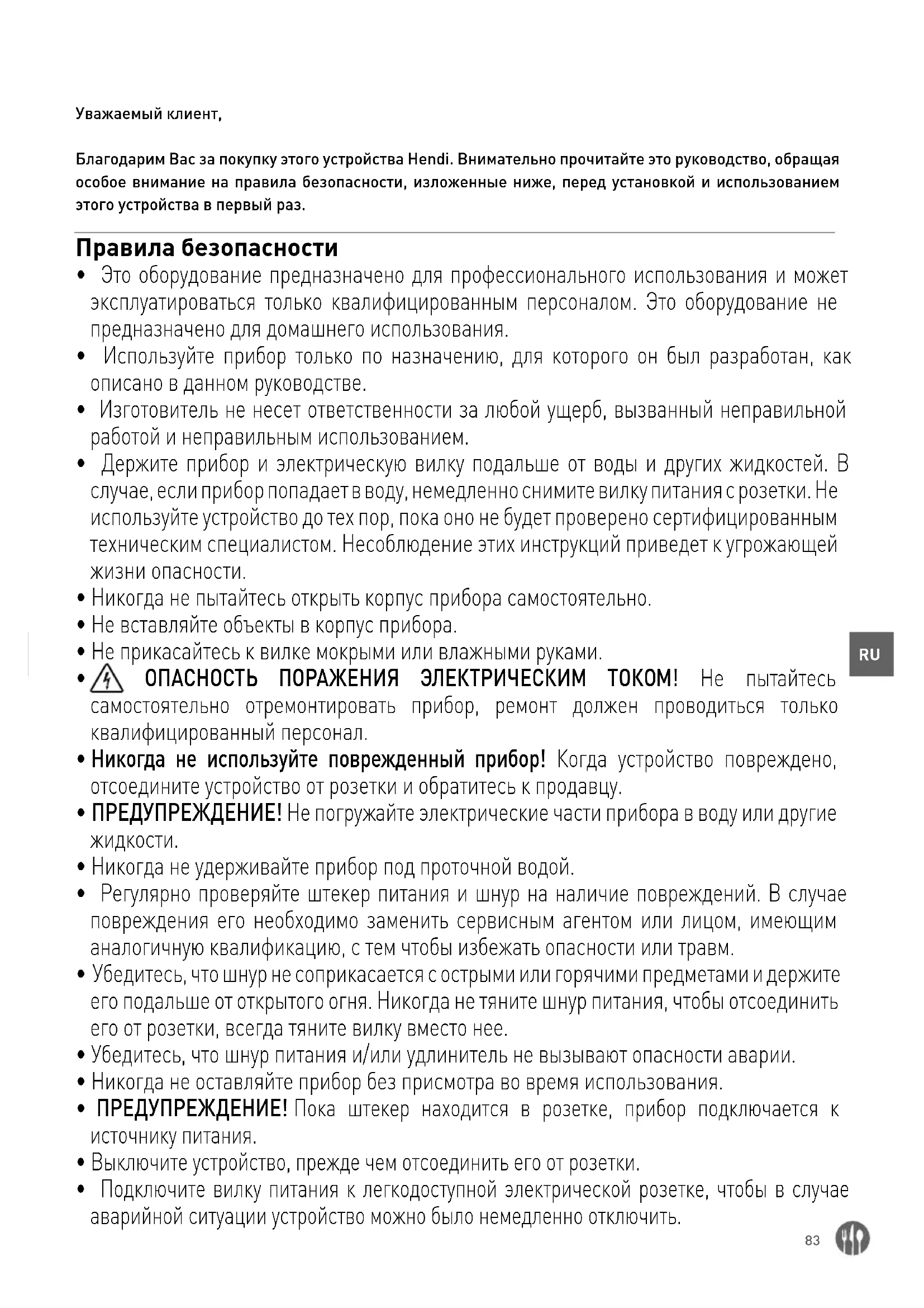 Уважаемый клиент, Благодарим Вас за покупку этого устройства Hendi. Внимательно прочитайте это руководство, обращая особое внимание на правила безопасности, изложенные ниже, перед установкой и использованием этого устройства в первый раз. Правила безопасности