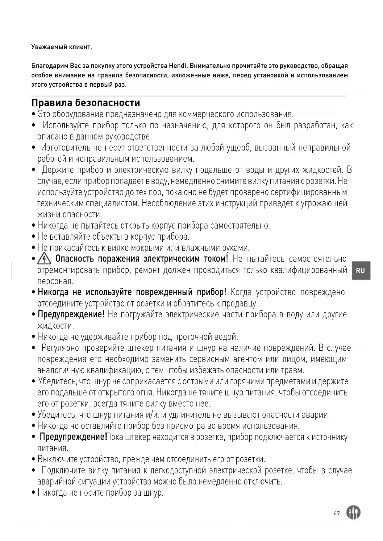 Уважаемый клиент, Благодарим Вас за покупку этого устройства Hendi. Внимательно прочитайте это руководство, обращая особое внимание на правила безопасности, изложенные ниже, перед установкой и использованием этого устройства в первый раз. Правила безопасности