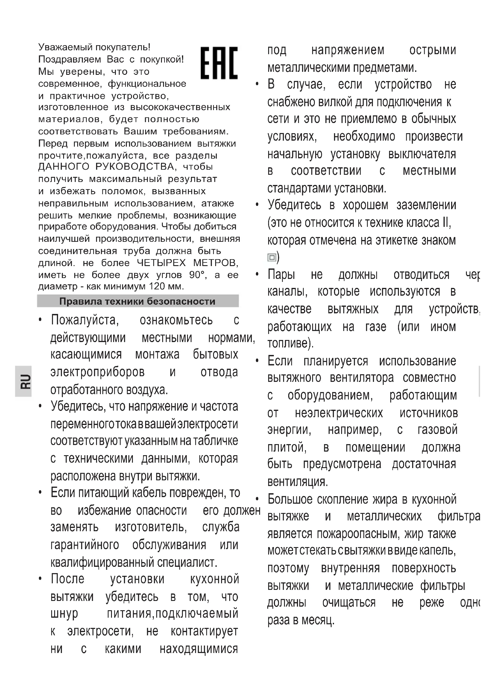 - Απορρίψτε τις κενές ή ελαττωματικές μπαταρίες σύμφωνα με τους τοπικούς κανονισμούς. - Μην πετάτε τις μπαταρίες σε οικιακά απορρίμματα.RU Уважаемый покупатель! Поздравляем Вас с покупкой! Мы уверены, что это современное, функциональное и практичное устройство, изготовленное из высококачественных материалов, будет полностью соответствовать Вашим требованиям. Перед первым использованием вытяжки прочтите,пожалуйста, все разделы ДАННОГО РУКОВОДСТВА, чтобы получить максимальный результат и избежать поломок, вызванных неправильным использованием, атакже решить мелкие проблемы, возникающие приработе оборудования. Чтобы добиться наилучшей производительности, внешняя соединительная труба должна быть длиной. не более ЧЕТЫРЕХ МЕТРОВ, иметь не более двух углов 90°, а ее диаметр - как минимум 120 мм.