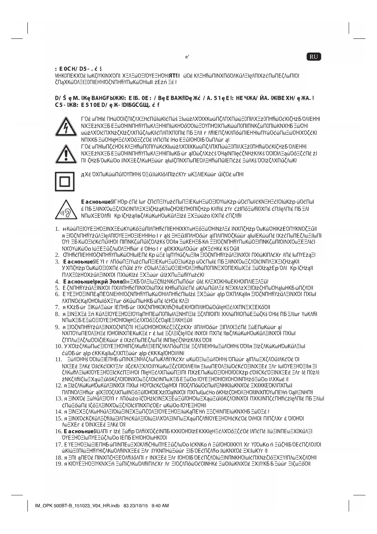 Не выбрасывайте этот прибор вместе с несортированными бытовыми отходами. Сдайте его в специализированный пункт сбора для утилизации отходов электрического и электронного оборудования (WEEE). Этим вы поможете сохранить ресурсы и защитить окружающую среду. Более подробную информацию вы можете получить у своего дистрибьютора или в местных органах власти. Пожалуйста, утилизируйте батарейки экологическим способом. Не выбрасывайте батарейки вместе с бытовым мусором. Пожалуйста, пользуйтесь системой возврата и сбора, работающей в Вашей местности, или обращайтесь в магазин, где Вы приобрели изделие. IM_OPK 500BT-B_151023_V04_HR.indb 90 23/10/15 9:40 AM91