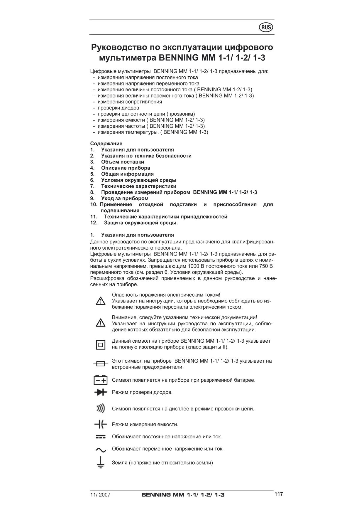 Данное руководство по эксплуатации предназначено для квалифицирован- ного электротехнического персонала. Цифровые мультиметры BENNING MM 1-1/ 1-2/ 1-3 предназначены для ра- боты в сухих условиях. Запрещается использовать прибор в цепях с номи- нальным напряжением, превышающим 1000 В постоянного тока или 750 В переменного тока (см. раздел 6. Условия окружающей среды). Расшифровка обозначений применяемых в данном руководстве и нане- сенных на приборе.