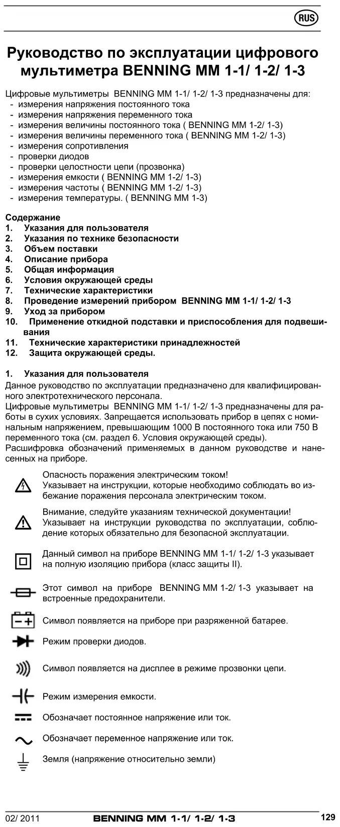 Данное руководство по эксплуатации предназначено для квалифицирован- ного электротехнического персонала. Цифровые мультиметры BENNING MM 1-1/ 1-2/ 1-3 предназначены для ра- боты в сухих условиях. Запрещается использовать прибор в цепях с номи- нальным напряжением, превышающим 1000 В постоянного тока или 750 В переменного тока (см. раздел 6. Условия окружающей среды). Расшифровка обозначений применяемых в данном руководстве и нане- сенных на приборе.