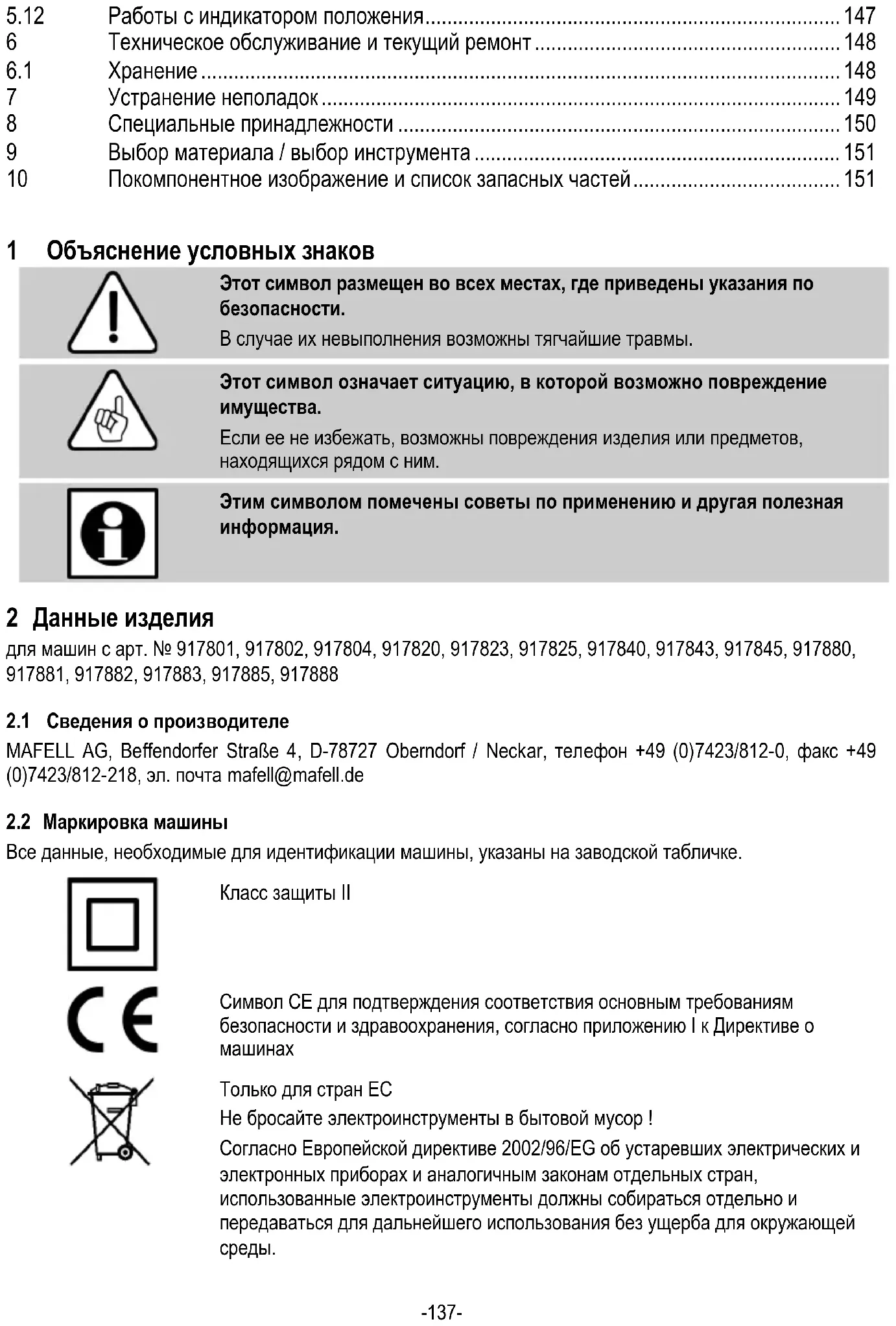 Специальное использование инструмента: - Диск пилы предназначен исключительно для обработки древесины, строительных плит из гипсокартона, алюминиевых соединений и плит из слоистого пластика. - Устройство для продольной разрезки (специальные принадлежности) предназначено исключительно для обработки древесины и строительных плит из гипсокартона. - Фреза с регулируемым приспособлением для выборки пазов предназначена исключительно для обработки древесины. - Фреза для работы по гипсокартону предназначена исключительно для обработки древесины и строительных плит из гипсокартона. - Фреза для обработки алюминиевых соединений предназначена исключительно для обработки алюминиевых соединительных плит. Используйте только разрешенные инструменты. Наши инструменты изготовлены в соответствии с EN 847-1. Использование не по назначению, описанному выше, запрещено. Производитель не несет ответственности за ущерб, возникший в результате такого другого использования. Чтобы использовать машины в соответствии с назначением, соблюдайте предписанные-140- компанией Mafell условия эксплуатации, техобслуживания и ремонта.