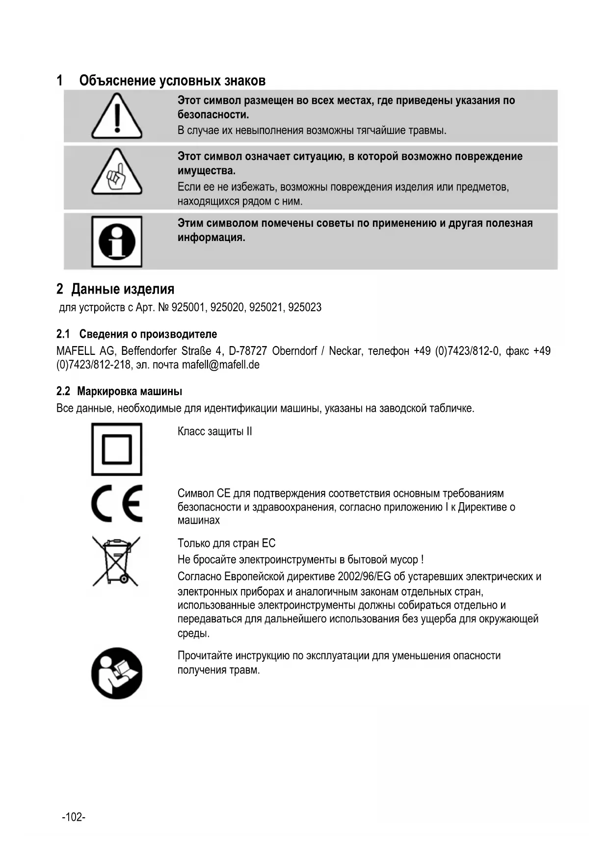 Всегда соблюдайте приведенные далее указания по безопасности и правила техники безопасности, действующие в стране, где применяется пила! Также ознакомьтесь с Указания по технике безопасности в прилагаемой брошюре «Указания по технике безопасности». - Запрещается работать без предписанного для соответствующих операций защитного оснащения и вносить изменения, способные повлиять на безопасность устройства. - Запрещается обращаться с этой машиной детям и подросткам. Исключение составляют подростки, работающие под наблюдением специалиста с целью обучения. - Каждый раз перед проведением работ проверяйте надежность крепления и отсутствие-106- повреждений защитных и рабочих устройств и их исправность, а также функционирование без заеданий подвижного защитного кожуха. - Учитывайте влияние окружающей среды. Не допускайте попадания устройства под дождь и избегайте работы во влажной и мокрой среде, а также вблизи от горючих жидкостей и газов. - При использовании машины вне помещения рекомендуется использование выключателя тока утечки. - Не переносите машину за кабель и не вытягивайте вилку из розетки за кабель. - Следите за тем, чтобы кабель был защищен от масла и высокой температуры и не перетягивался через острые кромки. - Поврежденные кабели или вилки следует немедленно заменить. Замена должна производиться только специалистами Mafell или авторизованным сервисным центром Mafell во избежание рисков угрозы для безопасности. - Избегайте резких перегибов кабеля. Особенно при транспортировке и хранении машины не наматывайте кабель вокруг машины. - Используйте только фрезерные головки с характеристиками, указанными в настоящей инструкции. - Храните машину только в сухих, закрытых помещениях, недоступных для детей. Указания по применению средств личной