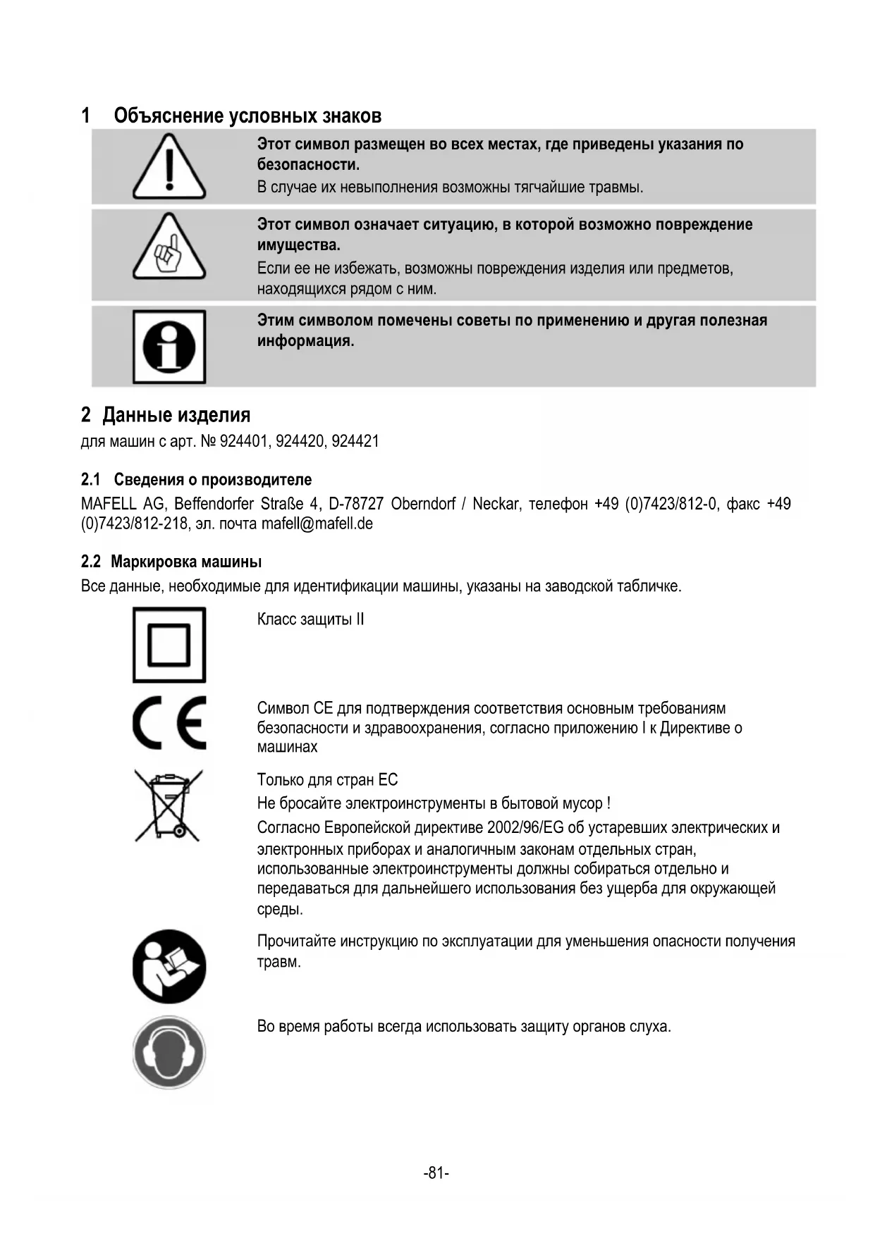 Всегда соблюдайте приведенные далее указания по безопасности и правила техники безопасности, действующие в стране, где применяется пила! Также прочитайте указания по технике безопасности в прилагаемой брошюре 070500 «Указания по технике безопасности» (в соответствии с требованиями стандарта 62841- 1).-84- Общие указания: - Запрещается обращаться с этой машиной детям и подросткам. Исключение составляют подростки, работающие под наблюдением специалиста с целью обучения. - Ни в коем случае не работайте без защитных приспособлений, использование которых предписано для определенных рабочих операций, и не изменяйте в машине ничего, что могло бы отрицательно сказаться на ее безопасности. - При использовании машины вне помещения рекомендуется использование выключателя тока утечки. - Поврежденные кабели или вилки следует немедленно заменить. Замена должна производиться только специалистами Mafell или авторизованным сервисным центром Mafell во избежание рисков угрозы для безопасности. - Перед проведением любых работ проверьте, надежно ли закреплены и не повреждены ли устройства безопасности и рабочие приспособления. Поврежденные защитные приспособления и детали должны быть надлежащим образом отремонтированы или