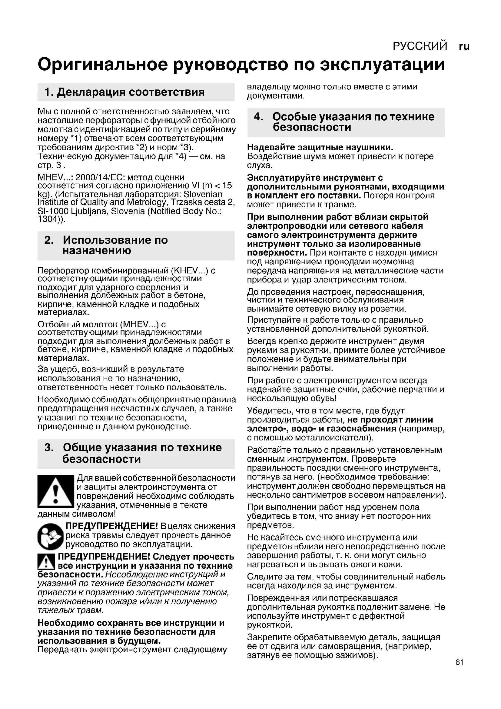 Оригинальное руководство по эксплуатации Мы с полной ответственностью заявляем, что настоящие перфораторы с функцией отбойного молотка с идентификацией по типу и серийному номеру *1) отвечают всем соответствующим требованиям директив *2) и норм *3). Техническую документацию для *4) — см. на стр.3. MHEV...: 2000/14/ЕС: метод оценки соответствия согласно приложению VI (m < 15 kg). (Испытательная лаборатория: Slovenian Institute of Quality and Metrology, Trzaska cesta 2, SI-1000 Ljubljana, Slovenia (Notified Body No.: 1304)). Перфоратор комбинированный (KHEV...) с соответствующими принадлежностями подходит для ударного сверления