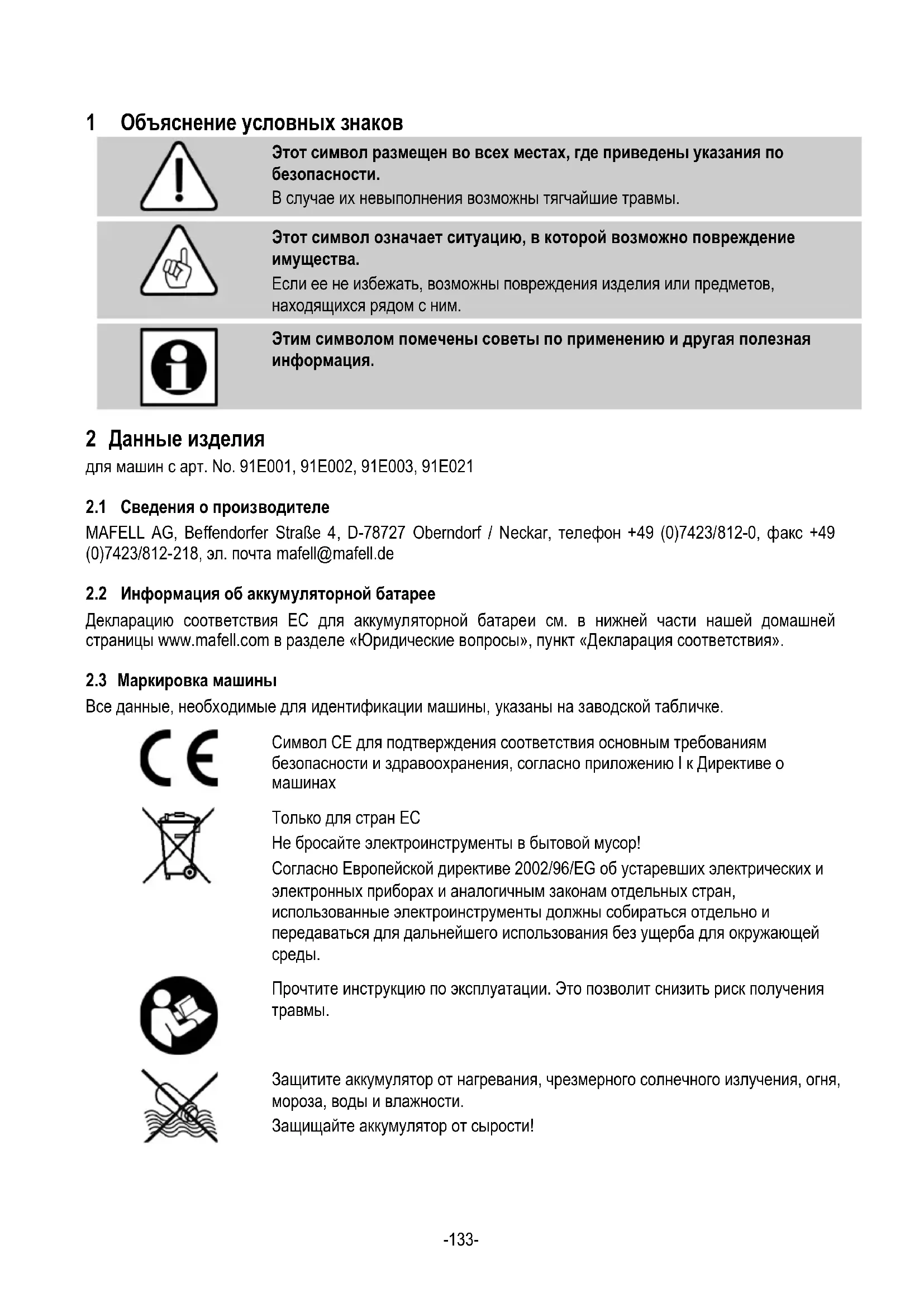 Декларацию соответствия ЕС для аккумуляторной батареи см. в нижней части нашей домашней страницы www.mafell.com в разделе «Юридические вопросы», пункт «Декларация соответствия».