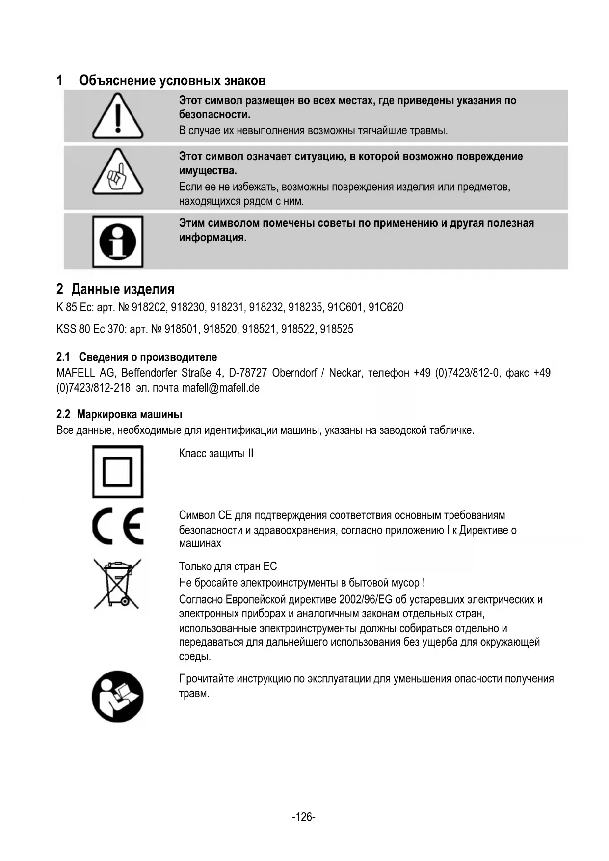 Этим символом помечены советы по применению и другая полезная информация. 2 Данные изделия K 85 Ec: арт. № 918202, 918230, 918231, 918232, 918235, 91C601, 91C620 KSS 80 Ec 370: арт. № 918501, 918520, 918521, 918522, 918525